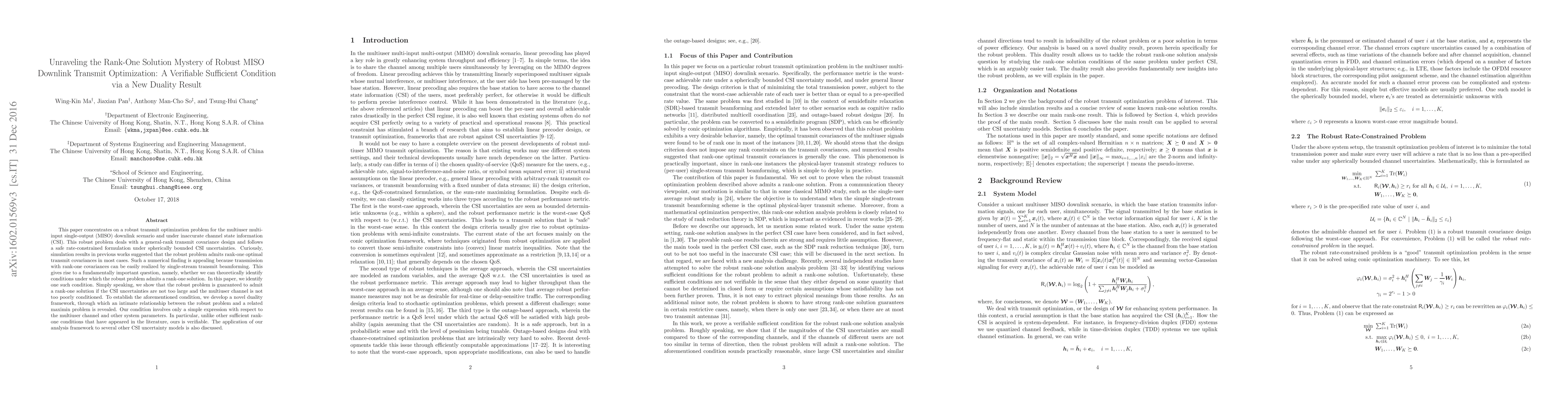 This paper concentrates on a robust transmit optimization problem for the multiuser multi-input single-output (MISO) downlink scenario and under inaccurate channel state information (CSI). This robust problem deals with a general-rank transmit covariance design, and it follows a safe rate-constrained formulation under spherically bounded CSI uncertainties. Curiously, simulation results in previous works suggested that the robust problem admits rank-one optimal transmit covariances in most cases. Such a numerical finding is appealing because transmission with rank-one covariances can be easily realized by single-stream transmit beamforming. This gives rise to a fundamentally important question, namely, whether we can theoretically identify conditions under which the robust problem admits a rank-one solution. In this paper, we identify one such condition. Simply speaking, we show that the robust problem is guaranteed to admit a rank-one solution if the CSI uncertainties are not too large and the multiuser channel is not too poorly conditioned. To establish the aforementioned condition, we develop a novel duality framework, through which an intimate relationship between the robust problem and a related maximin problem is revealed. Our condition involves only a simple expression with respect to the multiuser channel and other system parameters. In particular, unlike other sufficient rank-one conditions that have appeared in the literature, ours is verifiable. The application of our analysis framework to several other CSI uncertainty models is also discussed.