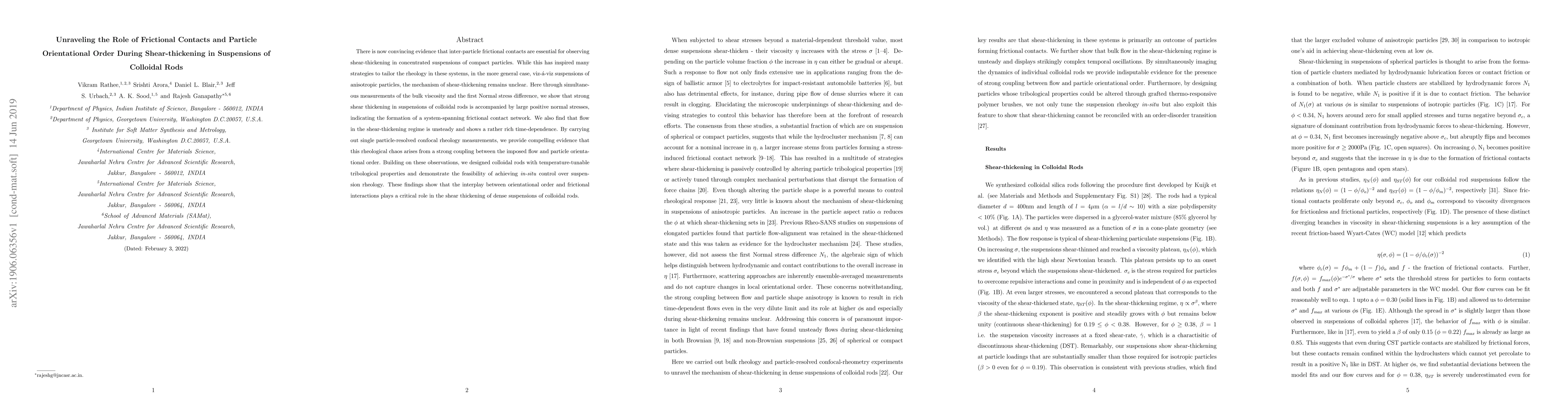 This work distinguishes itself by providing direct evidence of the strong coupling between flow and particle orientational order in shear-thickening suspensions of anisotropic particles, and by demonstrating in-situ control over suspension rheology via temperature-tunable frictional contacts.