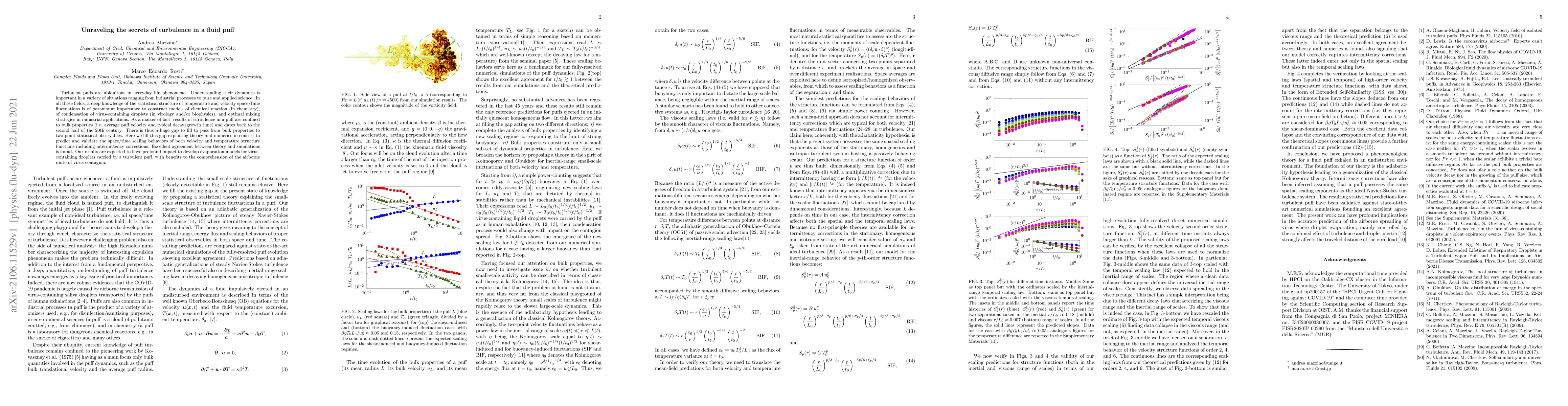 This paper fills a gap in understanding turbulence in fluid puffs by predicting and validating statistical properties of velocity and temperature fluctuations, which could lead to improved models for virus transmission and industrial processes.
