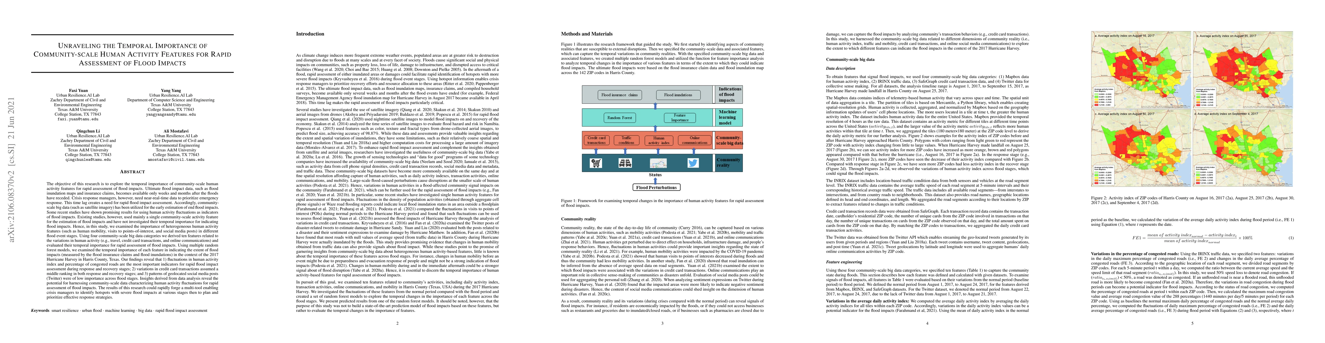 The objective of this research is to explore the temporal importance of community-scale human activity features for rapid assessment of flood impacts. Ultimate flood impact data, such as flood inundation maps and insurance claims, becomes available only weeks and months after the floods have receded. Crisis response managers, however, need near-real-time data to prioritize emergency response. This time lag creates a need for rapid flood impact assessment. Some recent studies have shown promising results for using human activity fluctuations as indicators of flood impacts. Existing studies, however, used mainly a single community-scale activity feature for the estimation of flood impacts and have not investigated their temporal importance for indicating flood impacts. Hence, in this study, we examined the importance of heterogeneous human activity features in different flood event stages. Using four community-scale big data categories we derived ten features related to the variations in human activity and evaluated their temporal importance for rapid assessment of flood impacts. Using multiple random forest models, we examined the temporal importance of each feature in indicating the extent of flood impacts in the context of the 2017 Hurricane Harvey in Harris County, Texas. Our findings reveal that 1) fluctuations in human activity index and percentage of congested roads are the most important indicators for rapid flood impact assessment during response and recovery stages; 2) variations in credit card transactions assumed a middle ranking; and 3) patterns of geolocated social media posts (Twitter) were of low importance across flood stages. The results of this research could rapidly forge a multi-tool enabling crisis managers to identify hotspots with severe flood impacts at various stages then to plan and prioritize effective response strategies.