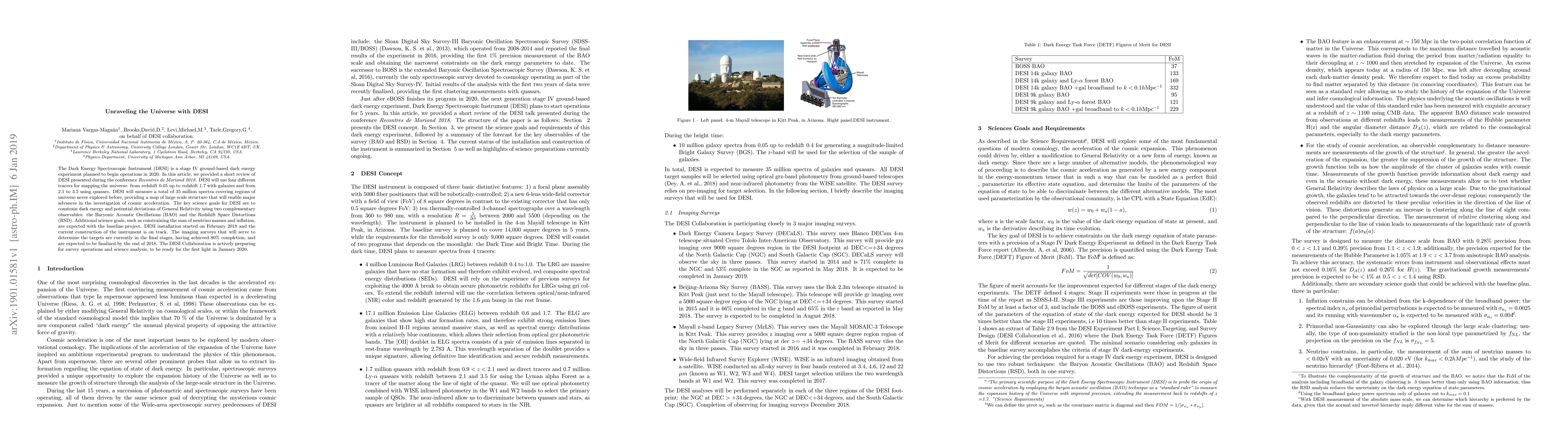 The Dark Energy Spectroscopic Instrument (DESI) aims to map the universe's large-scale structure by measuring 35 million spectra from galaxies and quasars, targeting cosmic acceleration and dark energy. DESI's key science goals include constraining dark energy and testing General Relativity using the Baryonic Acoustic Oscillations and Redshift Space Distortions.