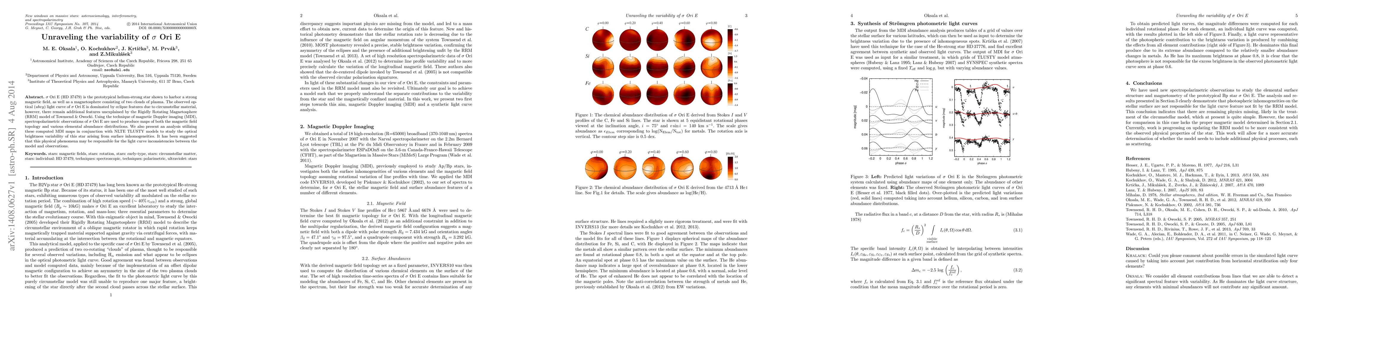 Sigma Ori E (HD 37479) is the prototypical helium-strong star shown to harbor a strong magnetic field, as well as a magnetosphere consisting of two clouds of plasma. The observed optical (ubvy) light curve of sigma Ori E is dominated by eclipse features due to circumstellar material, however, there remain additional features unexplained by the Rigidly Rotating Magnetosphere (RRM) model of Townsend & Owocki. Using the technique of magnetic Doppler imaging (MDI), spectropolarimetric observations of sigma Ori E are used to produce maps of both the magnetic field topology and various elemental abundance distributions. We also present an analysis utilizing these computed MDI maps in conjunction with NLTE TLUSTY models to study the optical brightness variability of this star arising from surface inhomogeneities. It has been suggested that this physical phenomena may be responsible for the light curve inconsistencies between the model and observations.