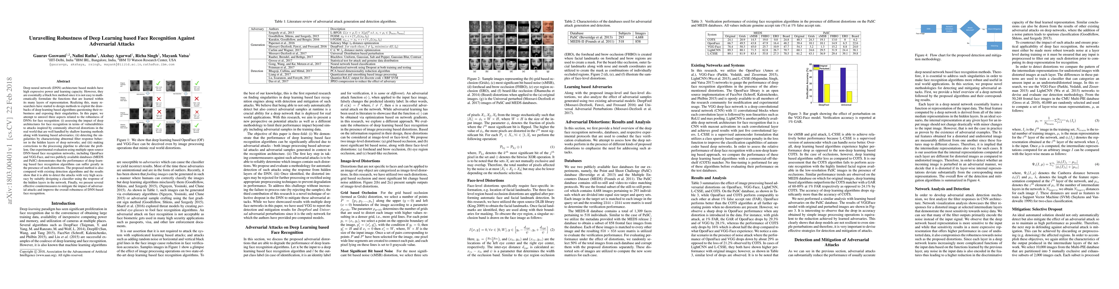 Deep neural network (DNN) architecture based models have high expressive power and learning capacity. However, they are essentially a black box method since it is not easy to mathematically formulate the functions that are learned within its many layers of representation. Realizing this, many researchers have started to design methods to exploit the drawbacks of deep learning based algorithms questioning their robustness and exposing their singularities. In this paper, we attempt to unravel three aspects related to the robustness of DNNs for face recognition: (i) assessing the impact of deep architectures for face recognition in terms of vulnerabilities to attacks inspired by commonly observed distortions in the real world that are well handled by shallow learning methods along with learning based adversaries; (ii) detecting the singularities by characterizing abnormal filter response behavior in the hidden layers of deep networks; and (iii) making corrections to the processing pipeline to alleviate the problem. Our experimental evaluation using multiple open-source DNN-based face recognition networks, including OpenFace and VGG-Face, and two publicly available databases (MEDS and PaSC) demonstrates that the performance of deep learning based face recognition algorithms can suffer greatly in the presence of such distortions. The proposed method is also compared with existing detection algorithms and the results show that it is able to detect the attacks with very high accuracy by suitably designing a classifier using the response of the hidden layers in the network. Finally, we present several effective countermeasures to mitigate the impact of adversarial attacks and improve the overall robustness of DNN-based face recognition.
