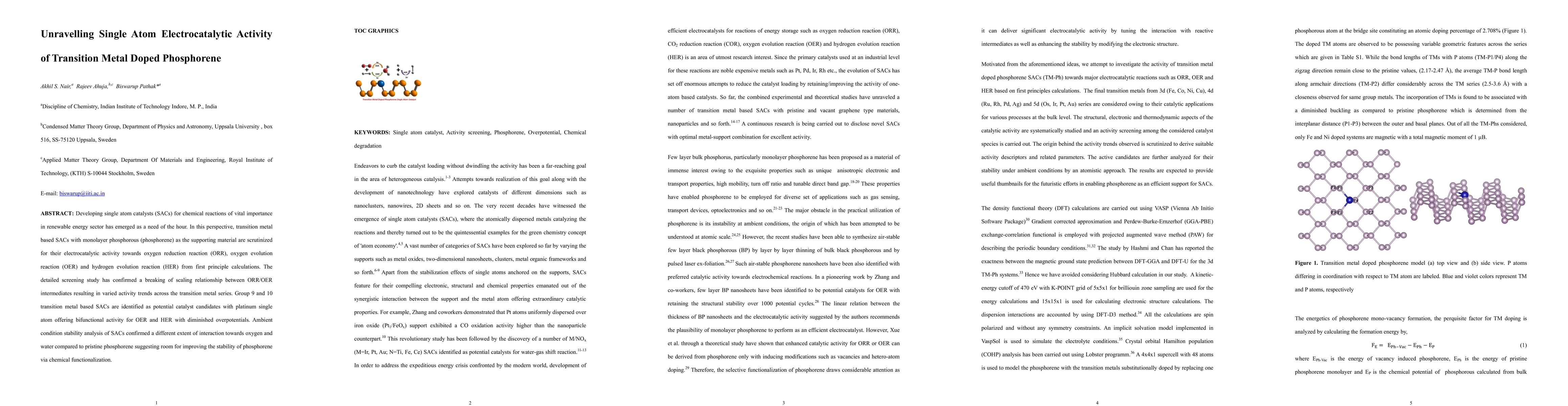 Developing single atom catalysts (SACs) for chemical reactions of vital importance in renewable energy sector has emerged as a need of the hour. In this perspective, transition metal based SACs with monolayer phosphorous (phosphorene) as the supporting material are scrutinized for their electrocatalytic activity towards oxygen reduction reaction (ORR), oxygen evolution reaction (OER) and hydrogen evolution reaction (HER) from first principle calculations. The detailed screening study has confirmed a breaking of scaling relationship between ORR/OER intermediates resulting in varied activity trends across the transition metal series. Group 9 and 10 transition metal based SACs are identified as potential catalyst candidates with platinum single atom offering bifunctional activity for OER and HER with diminished overpotentials. Ambient condition stability analysis of SACs confirmed a different extent of interaction towards oxygen and water compared to pristine phosphorene suggesting room for improving the stability of phosphorene via chemical functionalization.