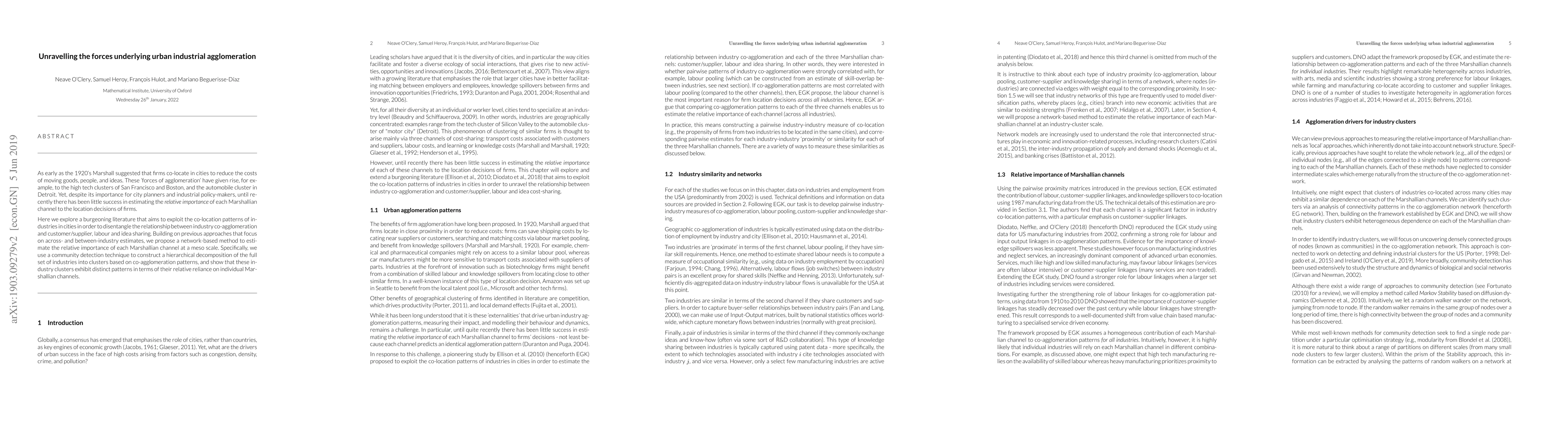 As early as the 1920's Marshall suggested that firms co-locate in cities to reduce the costs of moving goods, people, and ideas. These 'forces of agglomeration' have given rise, for example, to the high tech clusters of San Francisco and Boston, and the automobile cluster in Detroit. Yet, despite its importance for city planners and industrial policy-makers, until recently there has been little success in estimating the relative importance of each Marshallian channel to the location decisions of firms. Here we explore a burgeoning literature that aims to exploit the co-location patterns of industries in cities in order to disentangle the relationship between industry co-agglomeration and customer/supplier, labour and idea sharing. Building on previous approaches that focus on across- and between-industry estimates, we propose a network-based method to estimate the relative importance of each Marshallian channel at a meso scale. Specifically, we use a community detection technique to construct a hierarchical decomposition of the full set of industries into clusters based on co-agglomeration patterns, and show that these industry clusters exhibit distinct patterns in terms of their relative reliance on individual Marshallian channels.