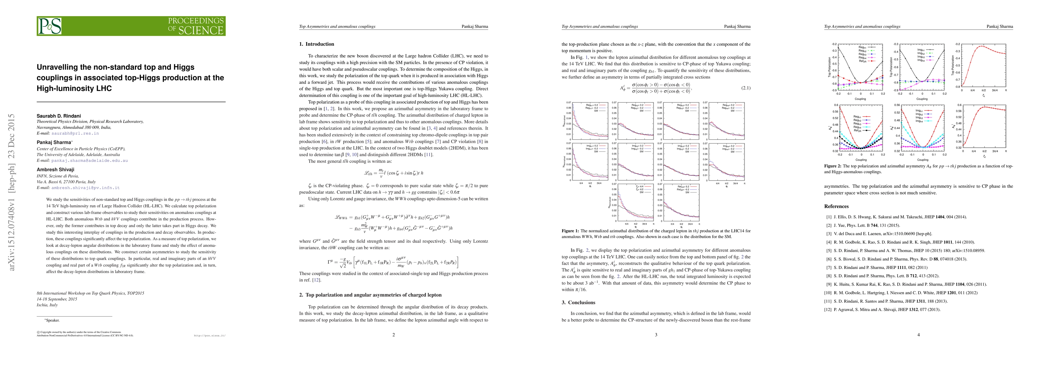 We study the sensitivities of non-standard top and Higgs couplings in the $pp\to thj$ process at the 14 TeV high-luminosity run of Large Hadron Collider (HL-LHC). We calculate top polarization and construct various lab-frame observables to study their sensitivities on anomalous couplings at HL-LHC. Both anomalous Wtb and hVV couplings contribute in the production process. However, only the former contributes in top decay and only the latter takes part in Higgs decay. We study this interesting interplay of couplings in the production and decay observables. In production, these couplings significantly affect the top polarization. As a measure of top polarization, we look at decay-lepton angular distributions in the laboratory frame and study the effect of anomalous couplings on these distributions. We construct certain asymmetries to study the sensitivity of these distributions to top quark couplings. In particular, real and imaginary parts of an hVV coupling and real part of a Wtb coupling f2R significantly alter the top polarization and, in turn, affect the decay-lepton distributions in laboratory frame.