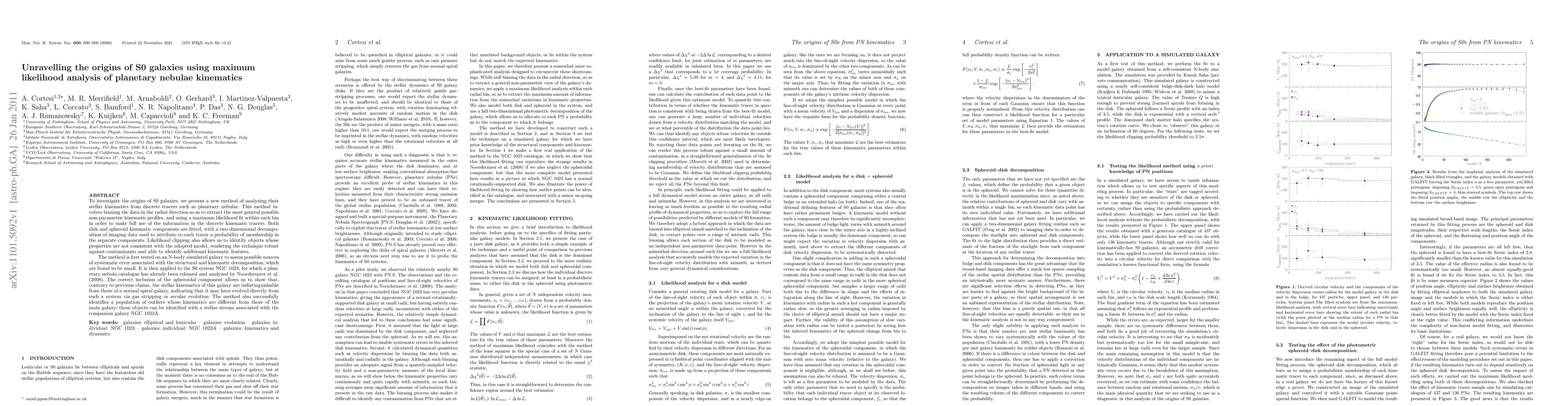 This paper introduces a novel maximum likelihood analysis method to study the stellar kinematics of S0 galaxies using planetary nebulae as tracers. The method reveals that the kinematics of NGC~1023 are similar to spiral galaxies, suggesting it may have evolved from one, while also identifying a stellar stream from a companion galaxy.