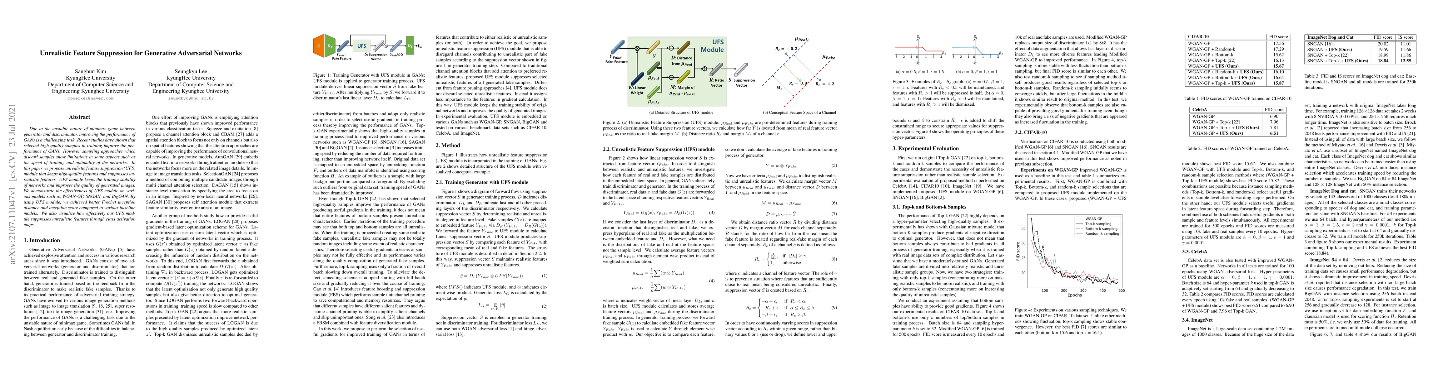 Due to the unstable nature of minimax game between generator and discriminator, improving the performance of GANs is a challenging task. Recent studies have shown that selected high-quality samples in training improve the performance of GANs. However, sampling approaches which discard samples show limitations in some aspects such as the speed of training and optimality of the networks. In this paper we propose unrealistic feature suppression (UFS) module that keeps high-quality features and suppresses unrealistic features. UFS module keeps the training stability of networks and improves the quality of generated images. We demonstrate the effectiveness of UFS module on various models such as WGAN-GP, SNGAN, and BigGAN. By using UFS module, we achieved better Frechet inception distance and inception score compared to various baseline models. We also visualize how effectively our UFS module suppresses unrealistic features through class activation maps.