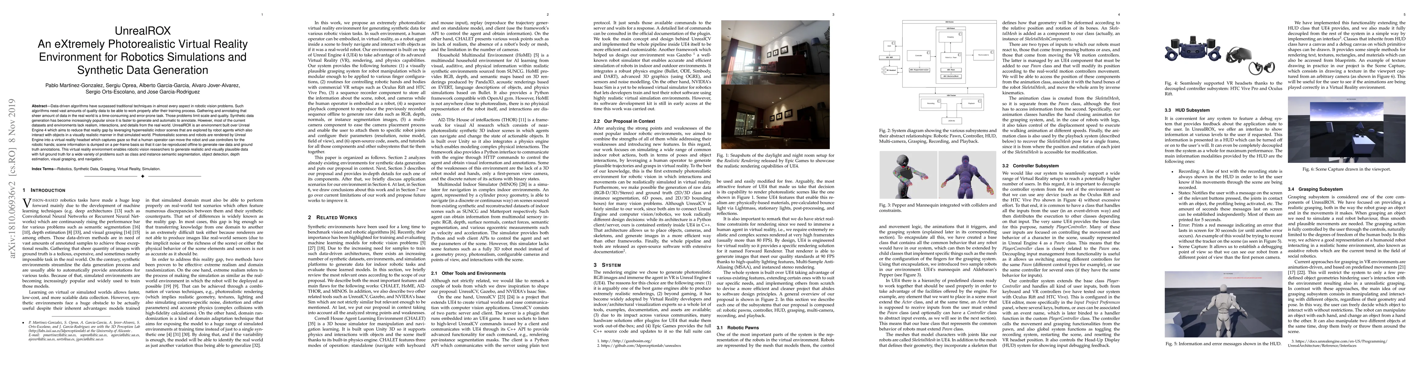 Data-driven algorithms have surpassed traditional techniques in almost every aspect in robotic vision problems. Such algorithms need vast amounts of quality data to be able to work properly after their training process. Gathering and annotating that sheer amount of data in the real world is a time-consuming and error-prone task. Those problems limit scale and quality. Synthetic data generation has become increasingly popular since it is faster to generate and automatic to annotate. However, most of the current datasets and environments lack realism, interactions, and details from the real world. UnrealROX is an environment built over Unreal Engine 4 which aims to reduce that reality gap by leveraging hyperrealistic indoor scenes that are explored by robot agents which also interact with objects in a visually realistic manner in that simulated world. Photorealistic scenes and robots are rendered by Unreal Engine into a virtual reality headset which captures gaze so that a human operator can move the robot and use controllers for the robotic hands; scene information is dumped on a per-frame basis so that it can be reproduced offline to generate raw data and ground truth annotations. This virtual reality environment enables robotic vision researchers to generate realistic and visually plausible data with full ground truth for a wide variety of problems such as class and instance semantic segmentation, object detection, depth estimation, visual grasping, and navigation.
