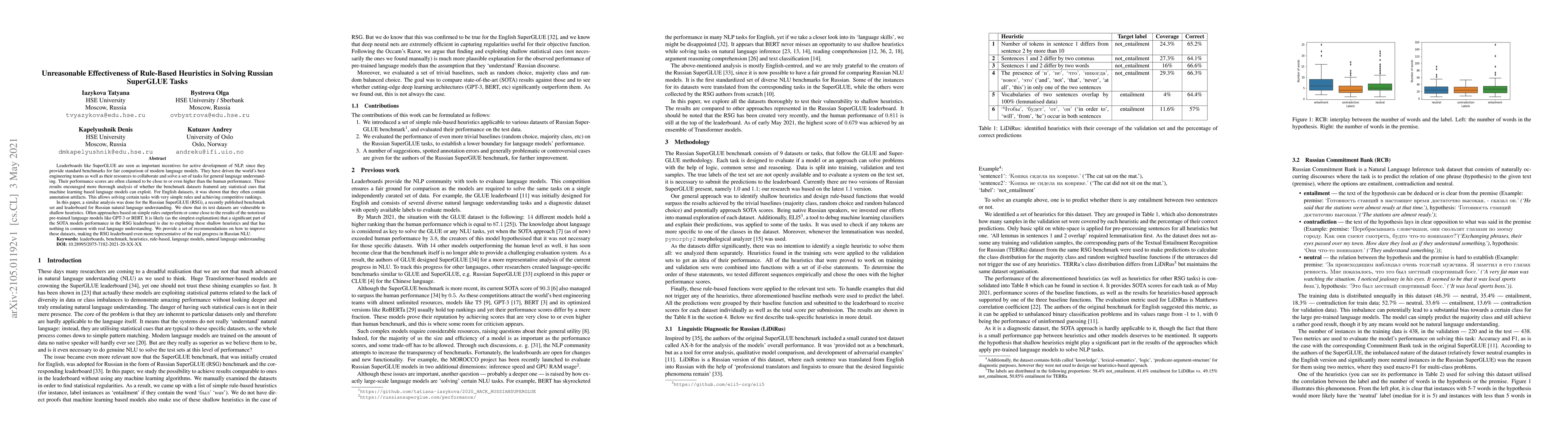 This paper investigates the Russian SuperGLUE benchmark, revealing that its test datasets can be solved using simple rule-based heuristics, often outperforming advanced pre-trained language models. It suggests that current top models may achieve high scores by exploiting these heuristics rather than true language understanding, and recommends improvements to the dataset for better evaluation of genuine NLU progress.