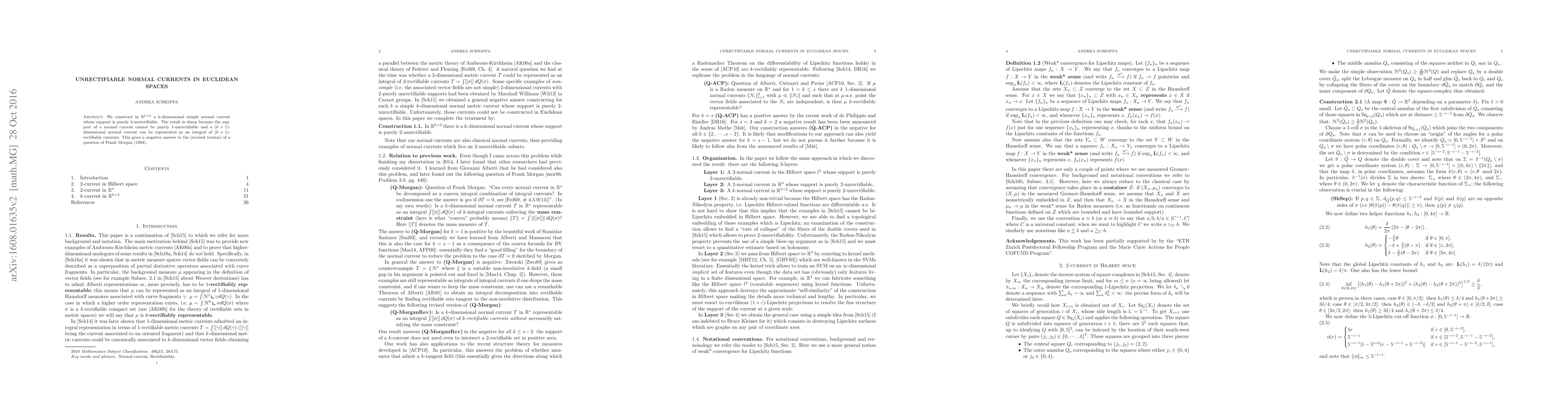 We construct in $\mathbb{R}^{k+2}$ a $k$-dimensional simple normal current whose support is purely $2$-unrectifiable. The result is sharp because the support of a normal current cannot be purely $1$-unrectifiable and a $(k+1)$-dimensional normal current can be represented as an integral of $(k+1)$-rectifiable currents. This gives a negative answer to the (revised version) of a question of Frank Morgan (1984).