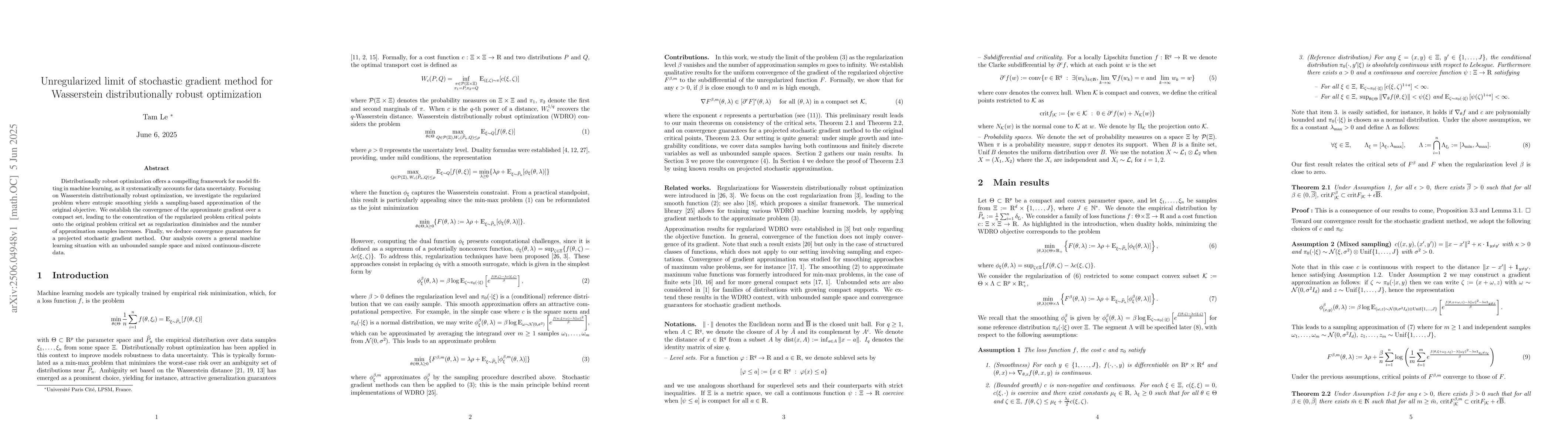 The paper presents a detailed mathematical analysis of the convergence properties of a stochastic gradient method for Wasserstein distributionally robust optimization, providing concentration guarantees for critical points and convergence results for a projected stochastic gradient method.