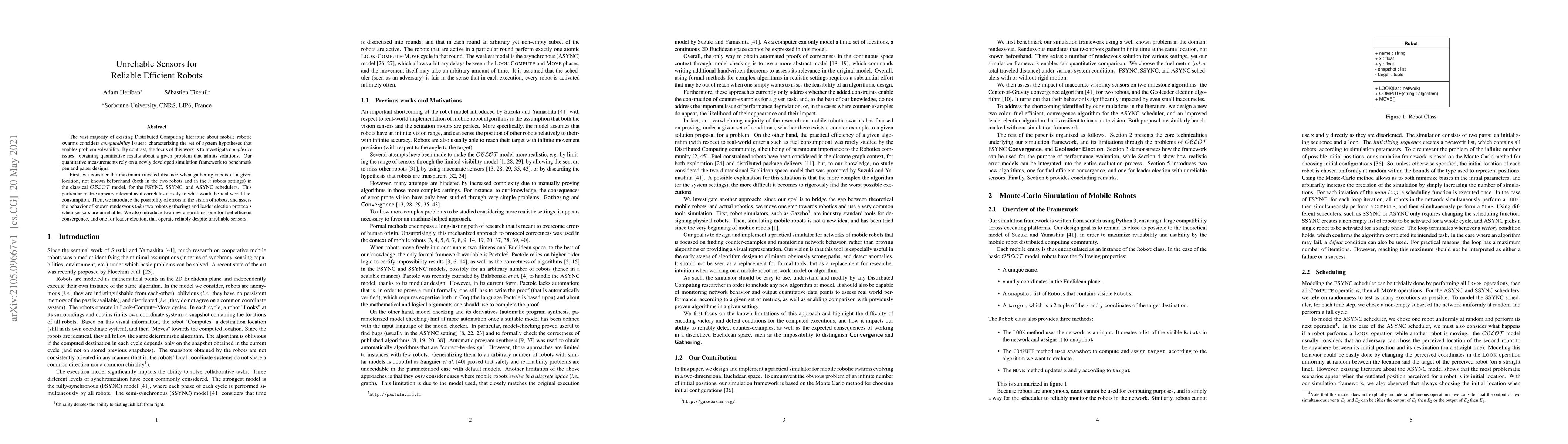 The vast majority of existing Distributed Computing literature about mobile robotic swarms considers computability issues: characterizing the set of system hypotheses that enables problem solvability. By contrast, the focus of this work is to investigate complexity issues: obtaining quantitative results about a given problem that admits solutions. Our quantitative measurements rely on a newly developed simulation framework to benchmark pen and paper designs. First, we consider the maximum traveled distance when gathering robots at a given location, not known beforehand (both in the two robots and in the n robots settings) in the classical OBLOT model, for the FSYNC, SSYNC, and ASYNC schedulers. This particular metric appears relevant as it correlates closely to what would be real world fuel consumption. Then, we introduce the possibility of errors in the vision of robots, and assess the behavior of known rendezvous (aka two robots gathering) and leader election protocols when sensors are unreliable. We also introduce two new algorithms, one for fuel efficient convergence, and one for leader election, that operate reliably despite unreliable sensors.