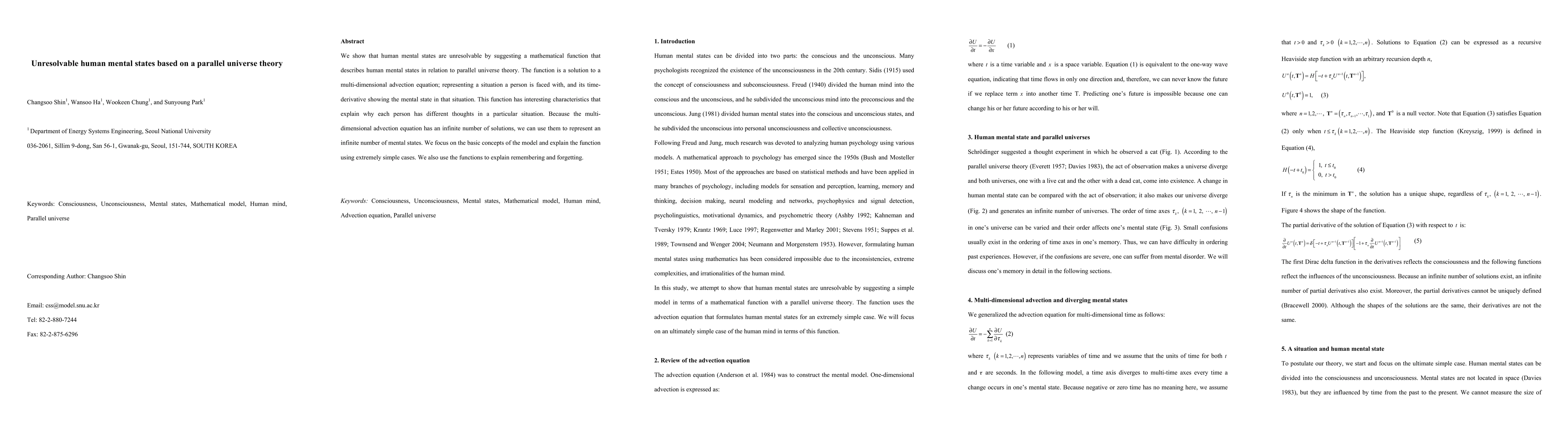 We show that human mental states are unresolvable by suggesting a mathematical function that describes human mental states in relation to parallel universe theory. The function is a solution to a multi-dimensional advection equation; representing a situation a person is faced with, and its time-derivative showing the mental state in that situation. This function has interesting characteristics that explain why each person has different thoughts in a particular situation. Because the multi-dimensional advection equation has an infinite number of solutions, we can use them to represent an infinite number of mental states. We focus on the basic concepts of the model and explain the function using extremely simple cases. We also use the functions to explain remembering and forgetting.