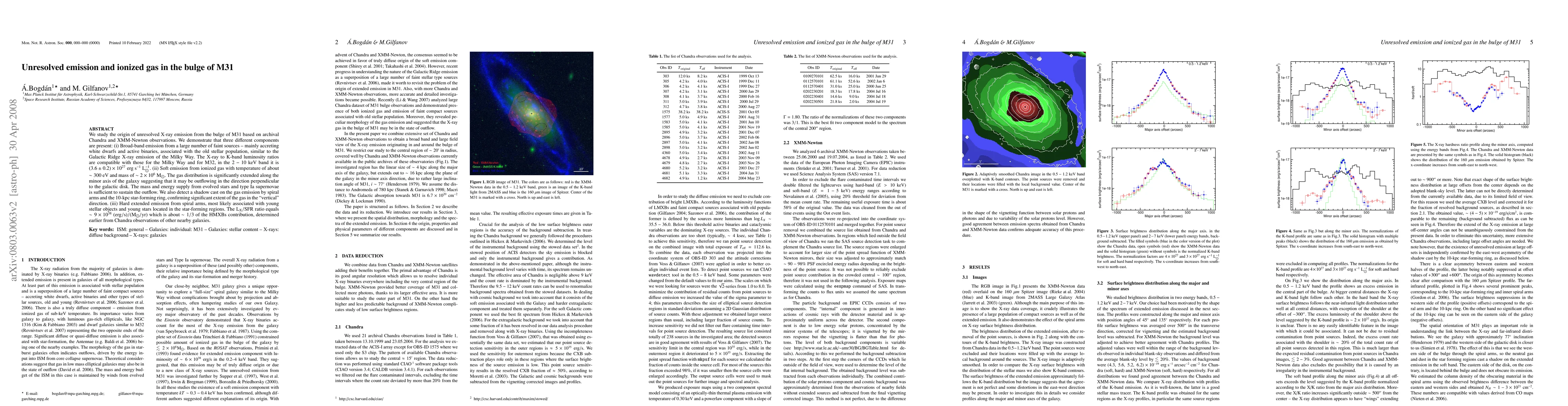 We study the origin of unresolved X-ray emission from the bulge of M31 based on archival Chandra and XMM-Newton observations. We demonstrate that three different components are present: (i) Broad-band emission from a large number of faint sources -- mainly accreting white dwarfs and active binaries, associated with the old stellar population, similar to the Galactic Ridge X-ray emission of the Milky Way. The X-ray to K-band luminosity ratios are compatible with those for the Milky Way and for M32, in the 2 - 10 keV band it is (3.6 +/- 0.2) x 10^27 erg/s/L_sun. (ii) Soft emission from ionized gas with temperature of about ~ 300 eV and mass of ~ 2 x 10^6 M_sun. The gas distribution is significantly extended along the minor axis of the galaxy suggesting that it may be outflowing in the direction perpendicular to the galactic disk. The mass and energy supply from evolved stars and type Ia supernovae is sufficient to sustain the outflow. We also detect a shadow cast on the gas emission by spiral arms and the 10-kpc star-forming ring, confirming significant extent of the gas in the ``vertical'' direction. (iii) Hard extended emission from spiral arms, most likely associated with young stellar objects and young stars located in the star-forming regions. The L_X/SFR ratio equals ~ 9 x 10^38 (erg/s)/(M_sun/yr) which is about ~ 1/3 of the HMXBs contribution, determined earlier from Chandra observations of other nearby galaxies.