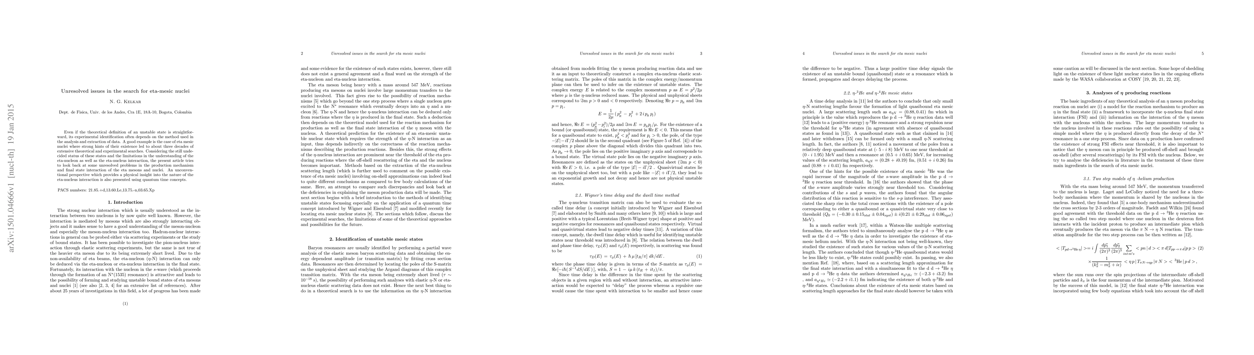 Even if the theoretical definition of an unstable state is straightforward, its experimental identification often depends on the method used in the analysis and extraction of data. A good example is the case of eta mesic nuclei where strong hints of their existence led to about three decades of extensive theoretical and experimental searches. Considering the still undecided status of these states and the limitations in the understanding of the eta-nucleon as well as the eta-nucleus interaction, the present article tries to look back at some unresolved problems in the production mechanism and final state interaction of the eta mesons and nuclei. An unconventional perspective which provides a physical insight into the nature of the eta-nucleus interaction is also presented using quantum time concepts.