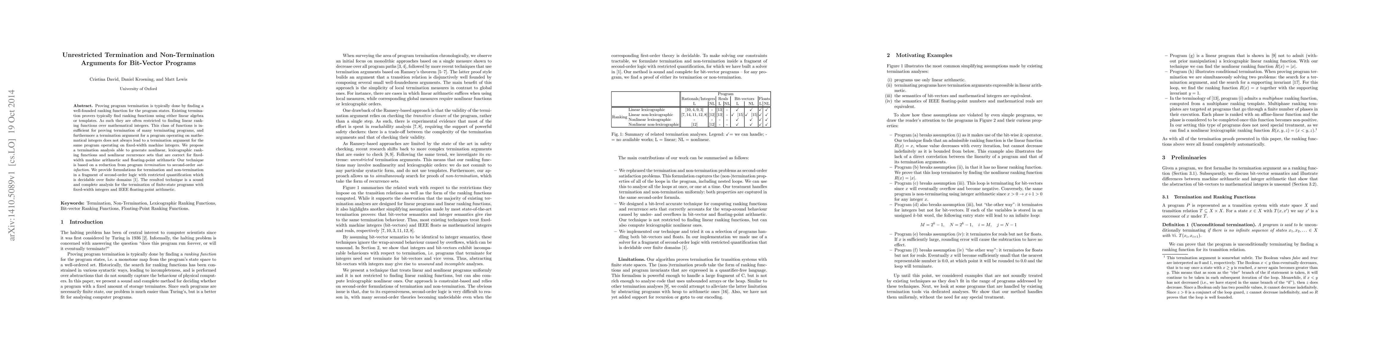 This research proposes a novel termination analysis technique for bit-vector programs that can generate nonlinear ranking functions for fixed-width machine integers and floating-point arithmetic. The technique reduces program termination to second-order satisfaction and provides decidable formulations for termination and non-termination in a restricted fragment of second-order logic.