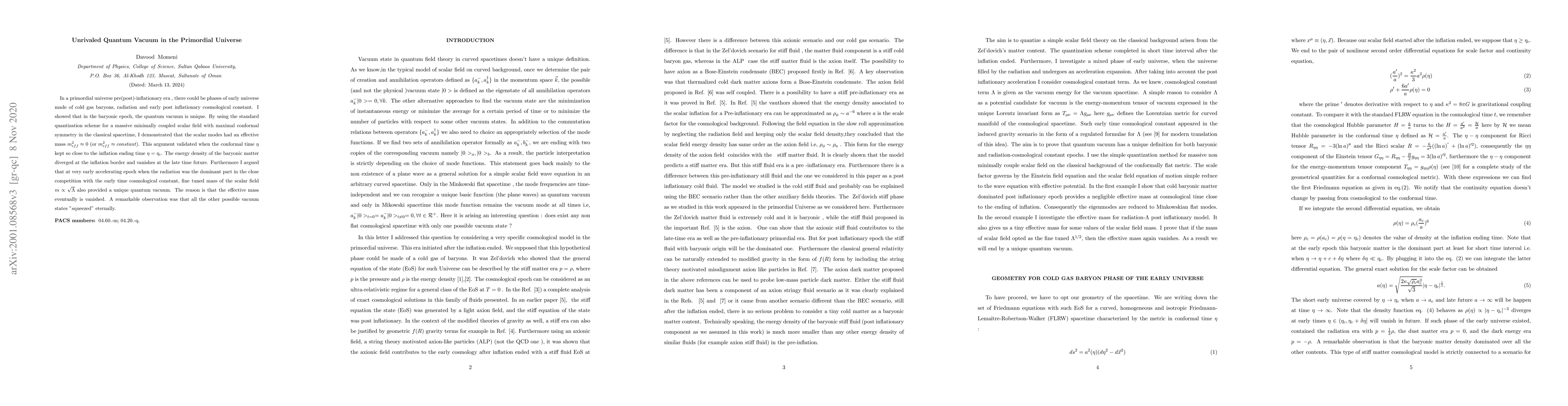 In a primordial universe pre(post)-inflationary era , there could be phases of early universe made of cold gas baryons, radiation and early post inflationary cosmological constant. I showed that in the baryonic epoch, the quantum vacuum is unique. By using the standard quantization scheme for a massive minimally coupled scalar field with maximal conformal symmetry in the classical spacetime, I demonstrated that the scalar modes had an effective mass $m_{eff}^2\approx 0$ (or $m_{eff}^2\approx constant$). This argument validated when the conformal time $\eta$ kept so close to the inflation ending time $\eta=\eta_c$. The energy density of the baryonic matter diverged at the inflation border and vanishes at the late time future. Furthermore I argued that at very early accelerating epoch when the radiation was the dominant part in the close competition with the early time cosmological constant, fine tuned mass of the scalar field $m\propto \sqrt{\Lambda}$ also provided a unique quantum vacuum. The reason is that the effective mass eventually is vanished. A remarkable observation was that all the other possible vacuum states "squeezed" eternally.
