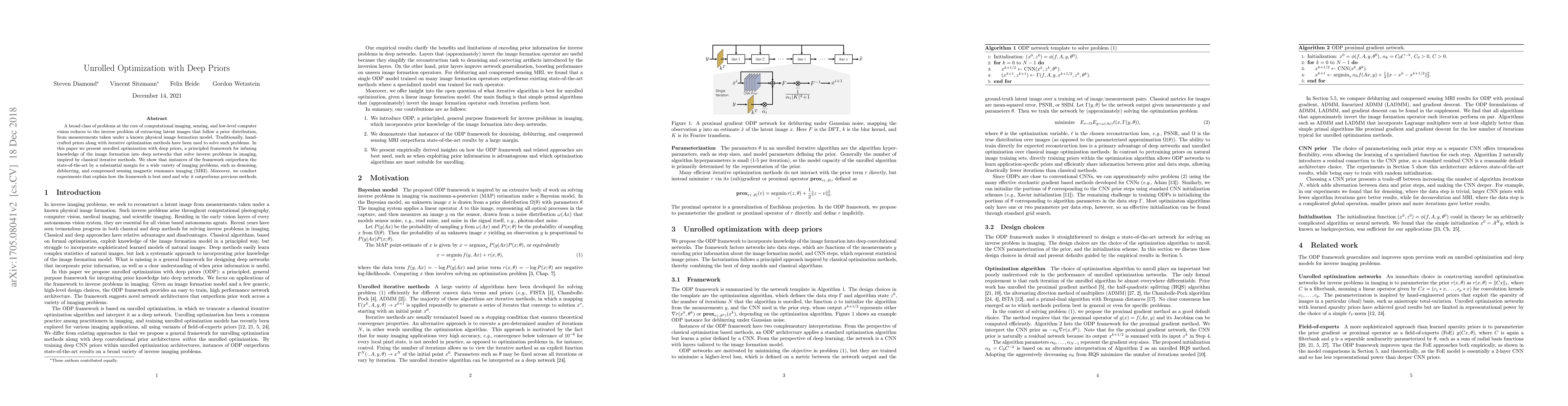 This paper introduces unrolled optimization with deep priors, a framework that integrates knowledge of image formation into deep networks to solve inverse problems in imaging. It demonstrates superior performance over state-of-the-art methods in tasks like denoising, deblurring, and MRI, and provides insights into the framework's advantages.
