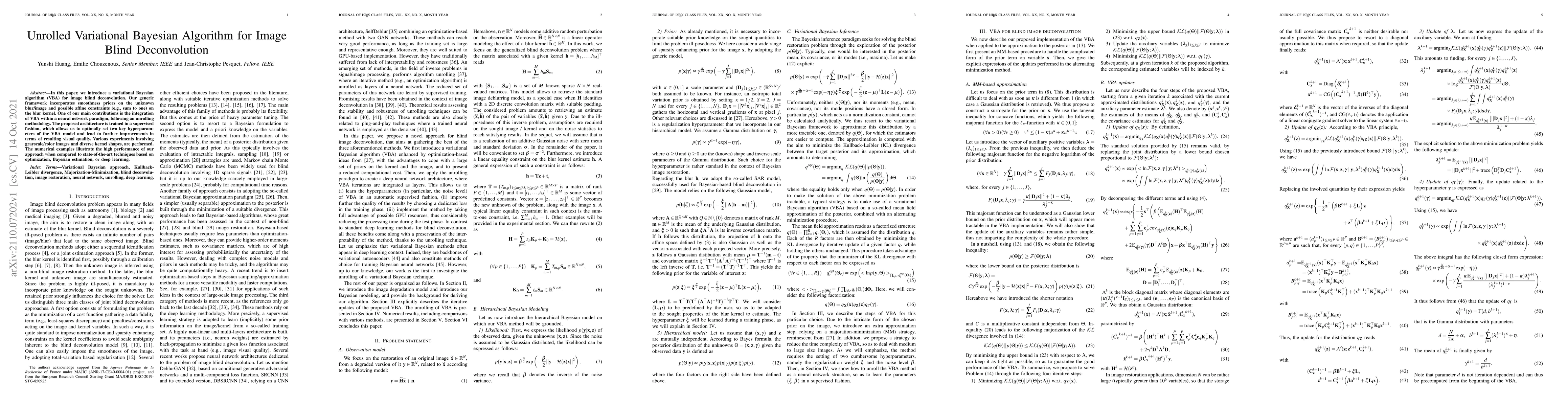 This paper presents an unrolled variational Bayesian algorithm integrated into a neural network for image blind deconvolution, optimizing hyperparameters through supervised training to achieve superior visual quality over existing optimization, Bayesian, and deep learning methods. Experiments on grayscale and color images with various kernel shapes demonstrate the method's high performance.