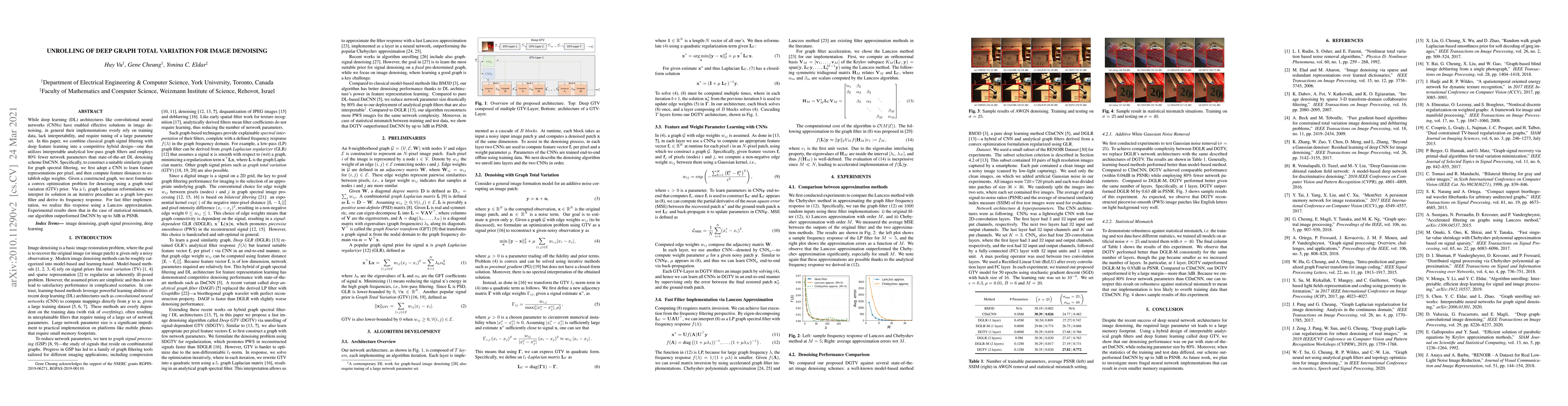 This research paper presents a hybrid image denoising method combining classical graph filtering with deep feature learning, achieving 80% fewer network parameters than state-of-the-art methods and outperforming them in PSNR by up to 3dB.