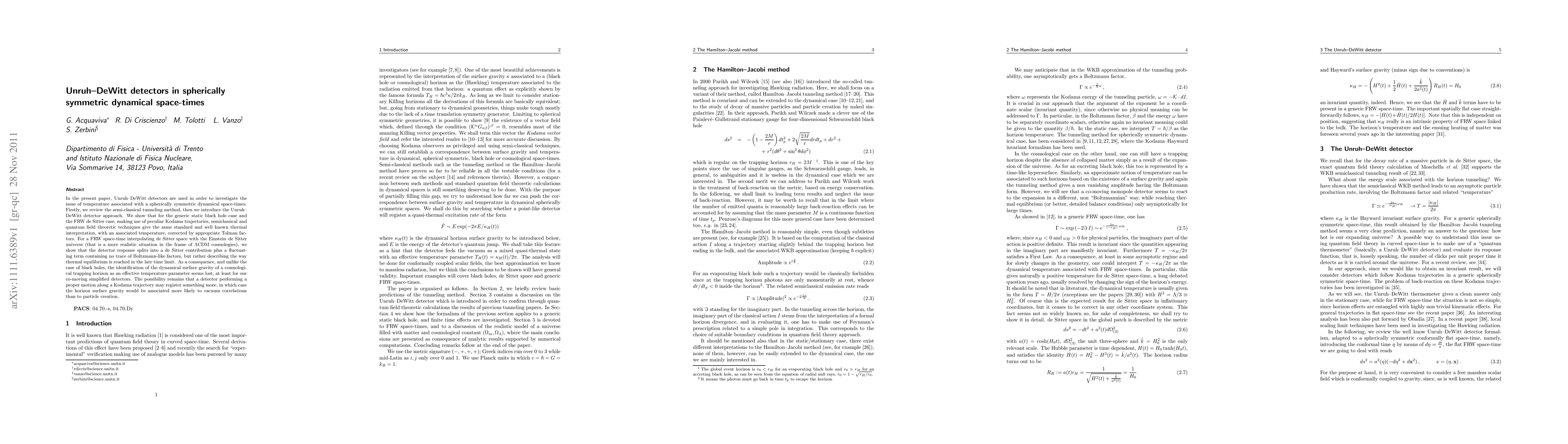 In the present paper, Unruh--DeWitt detectors are used in order to investigate the issue of temperature associated with a spherically symmetric dynamical space-times. Firstly, we review the semi-classical tunneling method, then we introduce the Unruh--DeWitt detector approach. We show that for the generic static black hole case and the FRW de Sitter case, making use of peculiar Kodama trajectories, semiclassical and quantum field theoretic techniques give the same standard and well known thermal interpretation, with an associated temperature, corrected by appropriate Tolman factors. For a FRW space-time interpolating de Sitter space with the Einstein--de Sitter universe (that is a more realistic situation in the frame of $\Lambda$CDM cosmologies), we show that the detector response splits into a de Sitter contribution plus a fluctuating term containing no trace of Boltzmann-like factors, but rather describing the way thermal equilibrium is reached in the late time limit. As a consequence, and unlike the case of black holes, the identification of the dynamical surface gravity of a cosmological trapping horizon as an effective temperature parameter seems lost, at least for our co-moving simplified detectors. The possibility remains that a detector performing a proper motion along a Kodama trajectory may register something more, in which case the horizon surface gravity would be associated more likely to vacuum correlations than to particle creation.