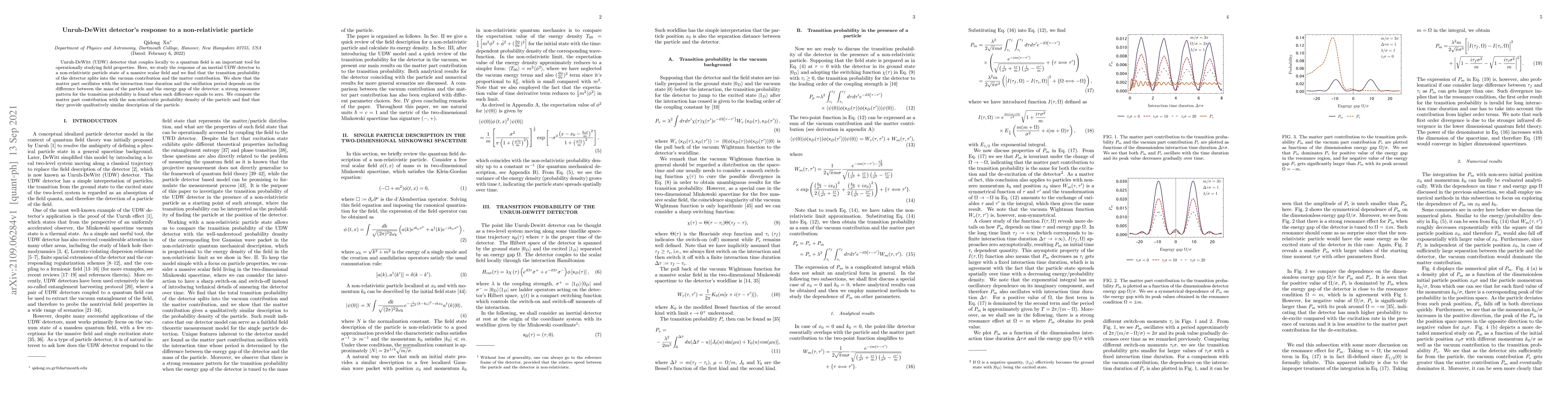 This study investigates the response of an inertial Unruh-Dewitt detector to a non-relativistic particle state, revealing that the transition probability splits into vacuum and matter contributions. The matter part exhibits oscillations dependent on the mass difference between the particle and the detector's energy gap, showing a strong resonance when this difference is zero.