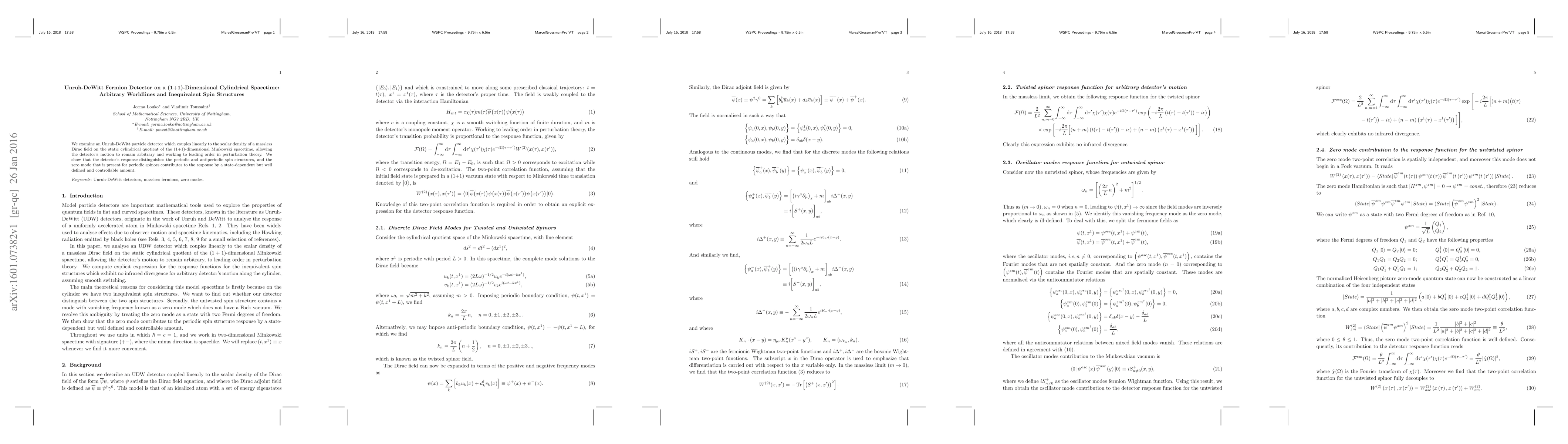 This paper investigates an Unruh-DeWitt fermion detector's response to a massless Dirac field in a (1+1)-dimensional cylindrical spacetime, revealing that the detector distinguishes between periodic and antiperiodic spin structures, with the zero mode contributing a state-dependent but controllable effect.