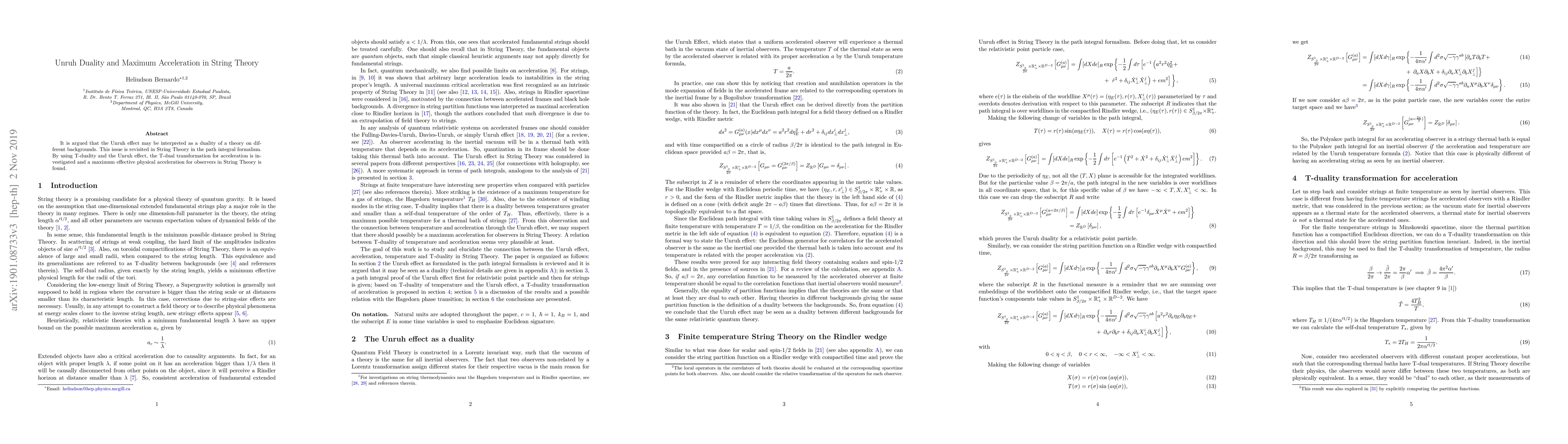 The paper explores the Unruh effect's interpretation as a duality in String Theory, revealing a maximum effective physical acceleration for observers through the application of T-duality and the Unruh effect in the path integral formalism.