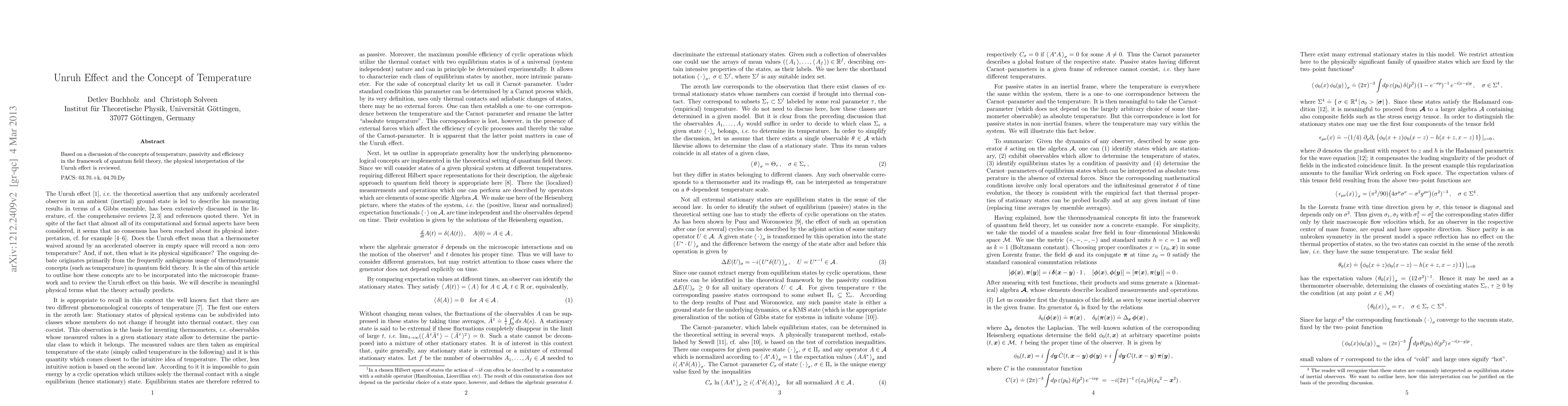 Summary: This paper reviews the Unruh effect within quantum field theory, exploring its physical interpretation through discussions on temperature, passivity, and efficiency. It aims to clarify how accelerated observers perceive a thermal radiation that stationary observers do not detect.