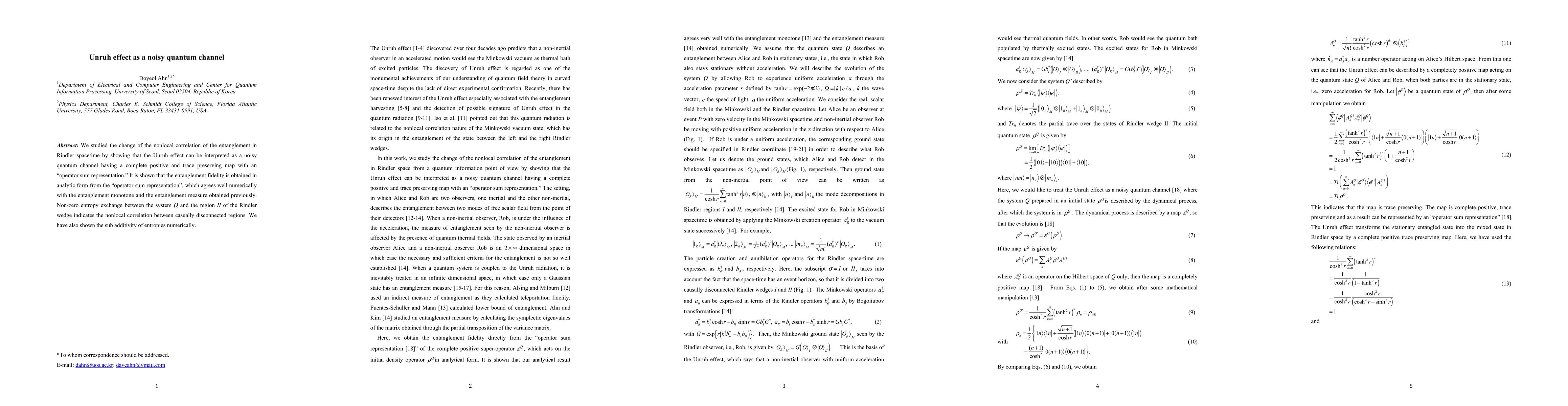 The paper explores the Unruh effect in Rindler spacetime, demonstrating it functions as a noisy quantum channel, and derives an analytic form for entanglement fidelity. It also reveals nonlocal correlation and sub-additivity of entropies between different regions.
