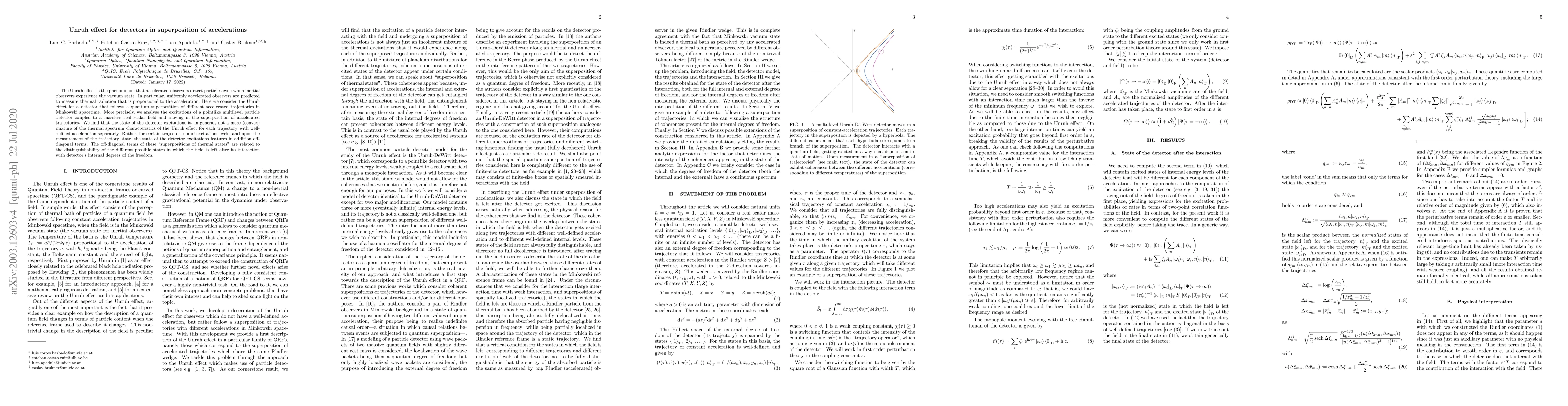 The Unruh effect is the phenomenon that accelerated observers detect particles even when inertial observers experience the vacuum state. In particular, uniformly accelerated observers are predicted to measure thermal radiation that is proportional to the acceleration. Here we consider the Unruh effect for a detector that follows a quantum superposition of different accelerated trajectories in Minkowski spacetime. More precisely, we analyse the excitations of a pointlike multilevel particle detector coupled to a massless real scalar field and moving in the superposition of accelerated trajectories. We find that the state of the detector excitations is, in general, not a mere (convex) mixture of the thermal spectrum characteristics of the Unruh effect for each trajectory with well-defined acceleration separately. Rather, for certain trajectories and excitation levels, and upon the measurement of the trajectory state, the state of the detector excitations features in addition off-diagonal terms. The off-diagonal terms of these "superpositions of thermal states" are related to the distinguishability of the different possible states in which the field is left after its interaction with detector's internal degrees of the freedom.