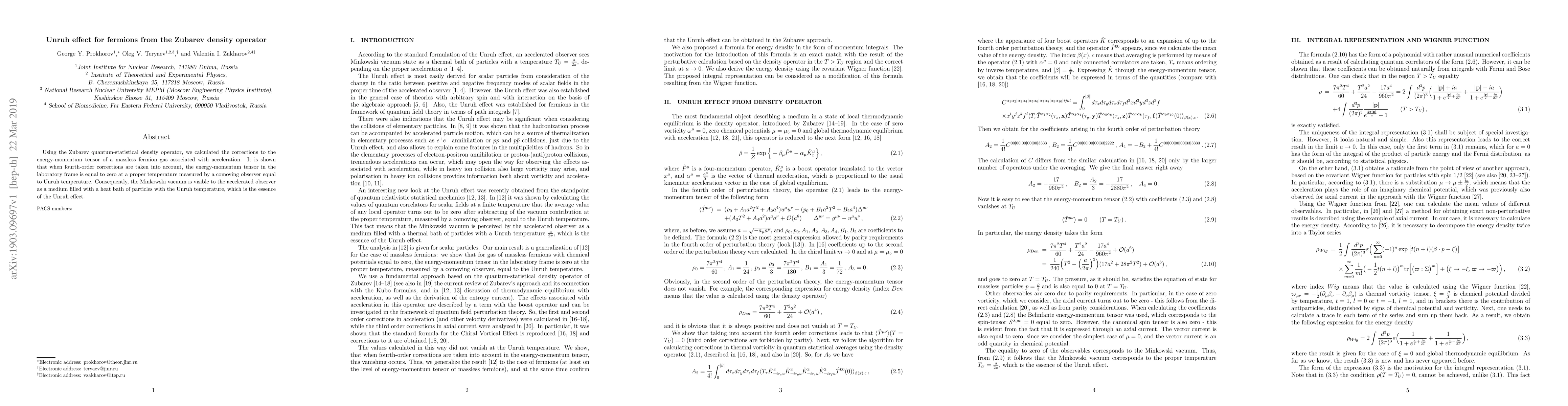 This paper calculates corrections to the energy-momentum tensor of a massless fermion gas in an accelerated frame using the Zubarev density operator, revealing that the Minkowski vacuum appears to an accelerated observer as a thermal bath at the Unruh temperature, demonstrating the Unruh effect.