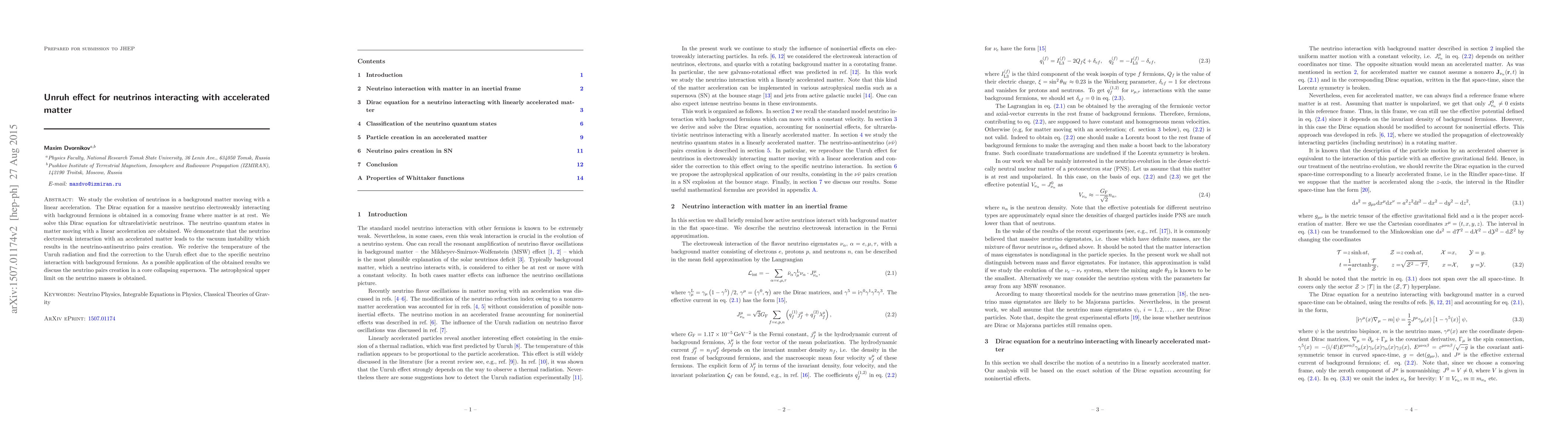 We study the evolution of neutrinos in a background matter moving with a linear acceleration. The Dirac equation for a massive neutrino electroweakly interacting with background fermions is obtained in a comoving frame where matter is at rest. We solve this Dirac equation for ultrarelativistic neutrinos. The neutrino quantum states in matter moving with a linear acceleration are obtained. We demonstrate that the neutrino electroweak interaction with an accelerated matter leads to the vacuum instability which results in the neutrino-antineutrino pairs creation. We rederive the temperature of the Unruh radiation and find the correction to the Unruh effect due to the specific neutrino interaction with background fermions. As a possible application of the obtained results we discuss the neutrino pairs creation in a core collapsing supernova. The astrophysical upper limit on the neutrino masses is obtained.