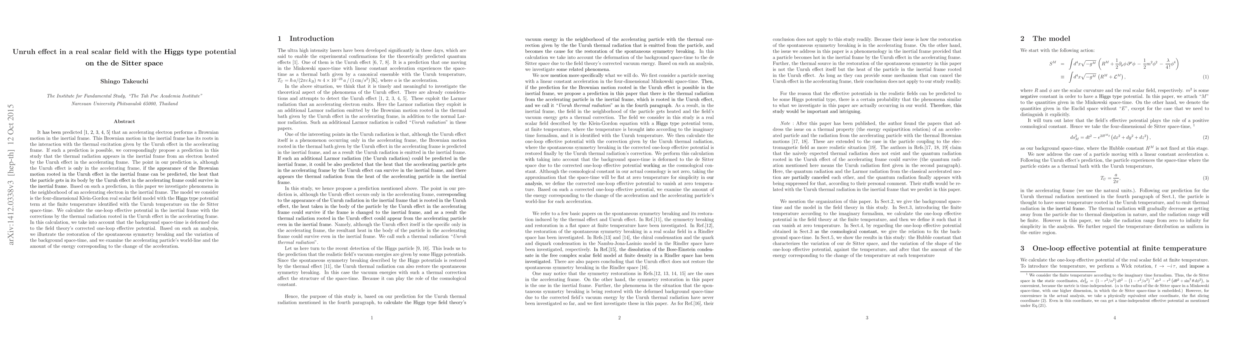 This paper investigates the Unruh effect on a real scalar field with a Higgs type potential in the context of de Sitter space, exploring how thermal radiation from an accelerating electron in an accelerating frame manifests in an inertial frame. It calculates the one-loop effective potential, demonstrating the restoration of spontaneous symmetry breaking and the deformation of space-time due to thermal corrections.
