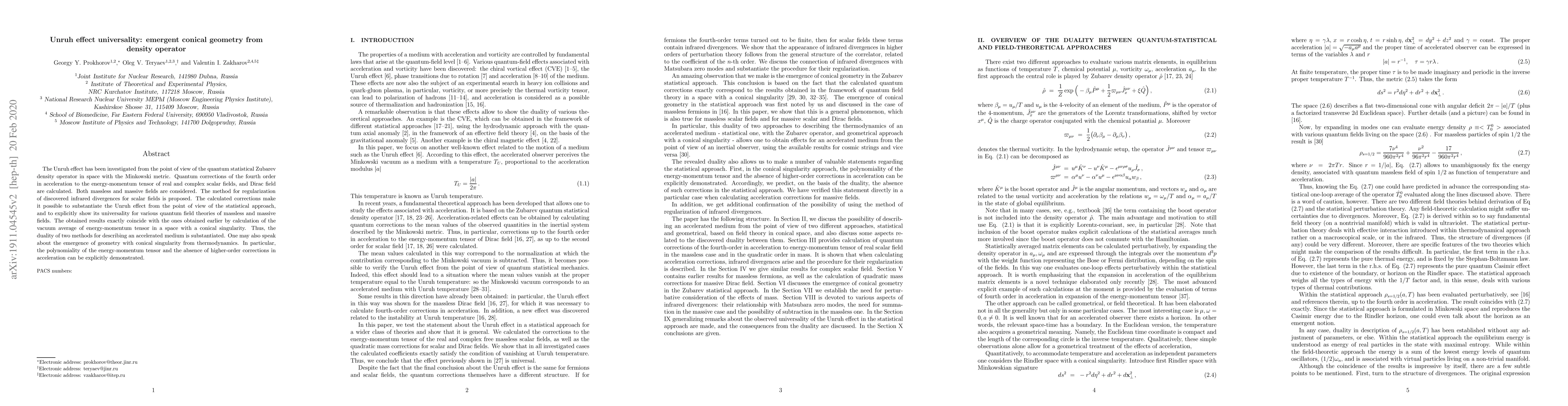 This paper investigates the Unruh effect using the Zubarev density operator and calculates quantum corrections to the energy-momentum tensor for scalar and Dirac fields, demonstrating its universality across various quantum field theories. The study reveals a duality between statistical and geometric approaches, showing the emergence of conical geometry from thermodynamic density operators.