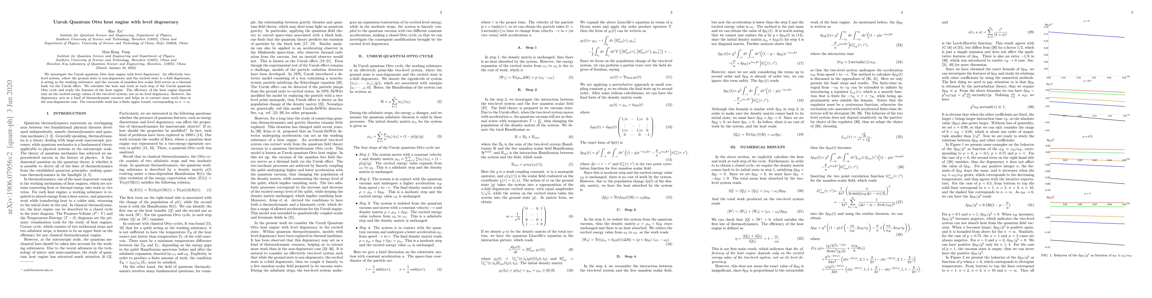 This paper examines the performance of an Unruh quantum Otto heat engine with a two-level system where the excited state is $n$-fold degenerate. It finds that while efficiency depends solely on the excited energy, the level degeneracy enhances work extraction, with a finite upper bound as degeneracy increases.