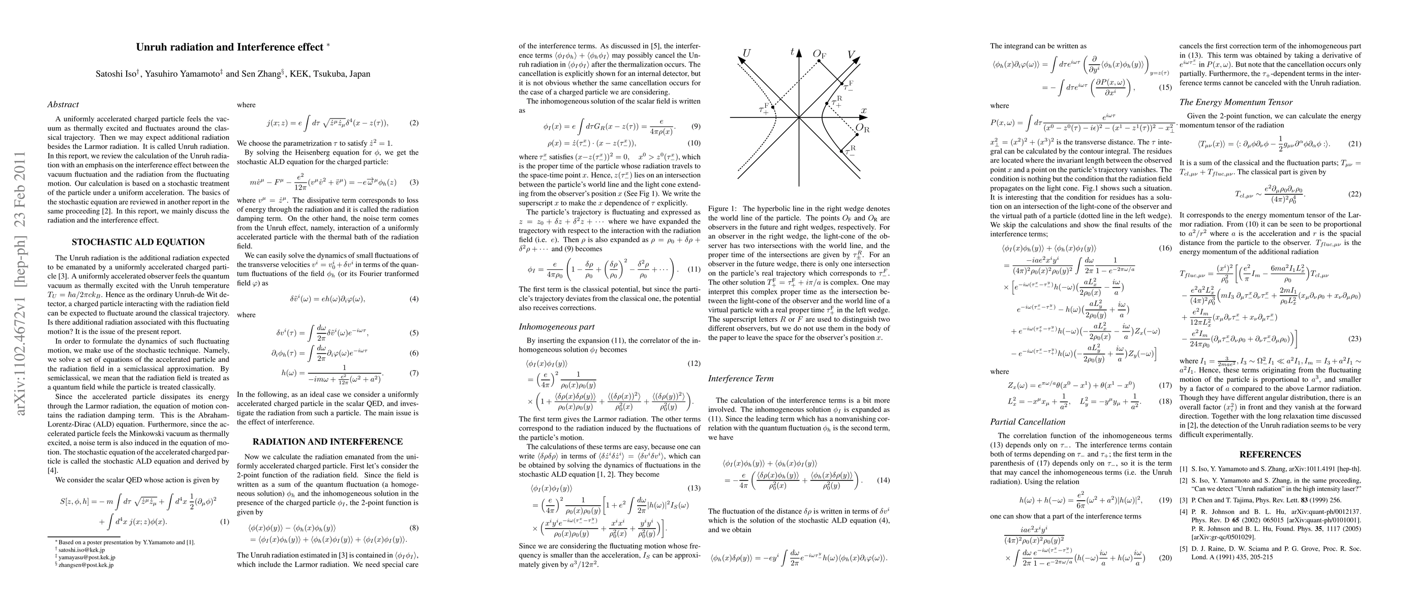 This paper reviews the calculation of Unruh radiation from a uniformly accelerated charged particle, focusing on the interference effect between vacuum fluctuations and the radiation from the particle's fluctuating motion. The analysis employs a stochastic treatment of the particle's acceleration.