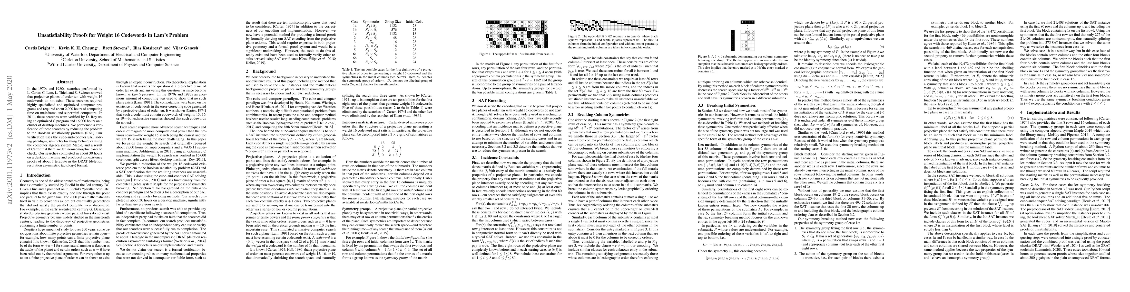 In the 1970s and 1980s, searches performed by L. Carter, C. Lam, L. Thiel, and S. Swiercz showed that projective planes of order ten with weight 16 codewords do not exist. These searches required highly specialized and optimized computer programs and required about 2,000 hours of computing time on mainframe and supermini computers. In 2011, these searches were verified by D. Roy using an optimized C program and 16,000 hours on a cluster of desktop machines. We performed a verification of these searches by reducing the problem to the Boolean satisfiability problem (SAT). Our verification uses the cube-and-conquer SAT solving paradigm, symmetry breaking techniques using the computer algebra system Maple, and a result of Carter that there are ten nonisomorphic cases to check. Our searches completed in about 30 hours on a desktop machine and produced nonexistence proofs of about 1 terabyte in the DRAT (deletion resolution asymmetric tautology) format.