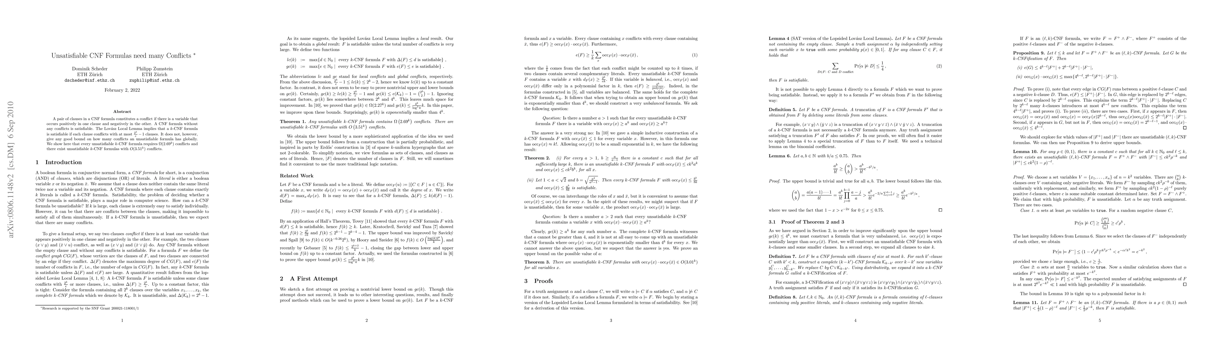 The paper demonstrates that unsatisfiable k-CNF formulas inherently require at least 2.69^k conflicts, while certain formulas can exhibit up to 3.51^k conflicts, highlighting the global conflict complexity in unsatisfiable cases.