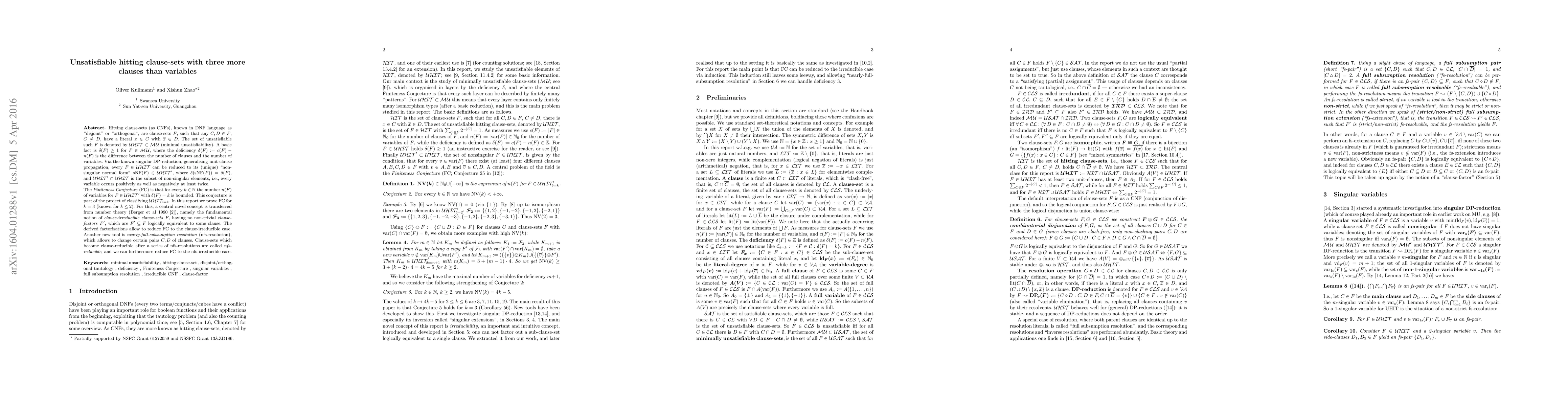 This paper proves the Finiteness Conjecture for minimally unsatisfiable clause-sets with a deficiency of 3, showing that there are only finitely many isomorphism types for hitting clause-sets. The authors utilize the concept of irreducible clause-sets, originally from number theory, to simplify and solve the problem.