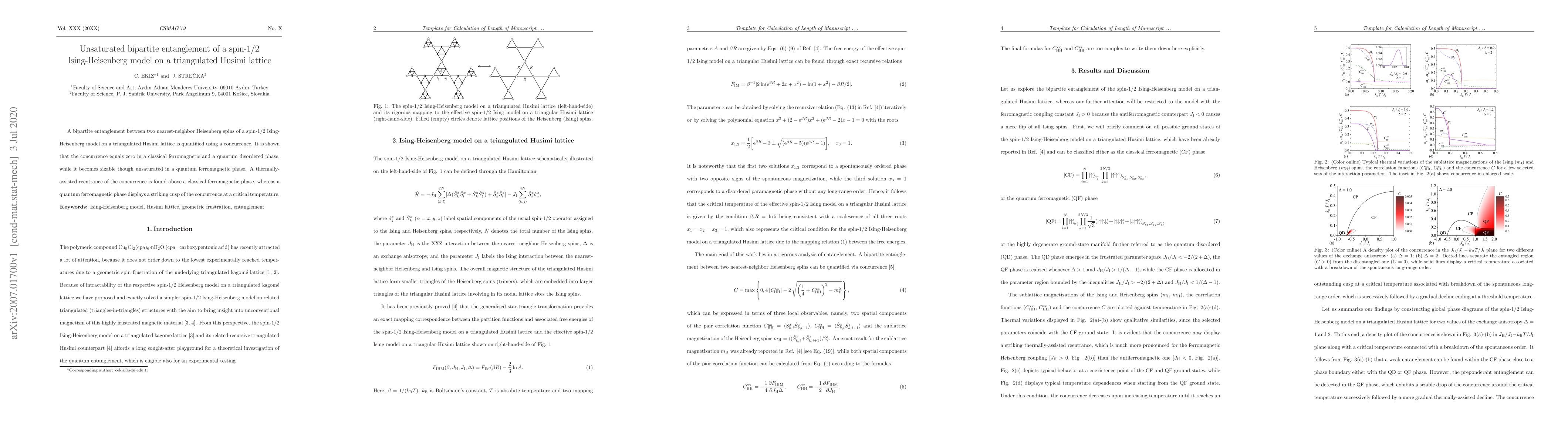 This paper quantifies bipartite entanglement in a spin-1/2 Ising-Heisenberg model on a triangulated Husimi lattice, finding zero concurrence in classical and quantum disordered phases but sizable, though unsaturated, concurrence in a quantum ferromagnetic phase. A thermally-assisted reentrance of concurrence is observed above the classical ferromagnetic phase, with a notable cusp in concurrence at a critical temperature in the quantum ferromagnetic phase.