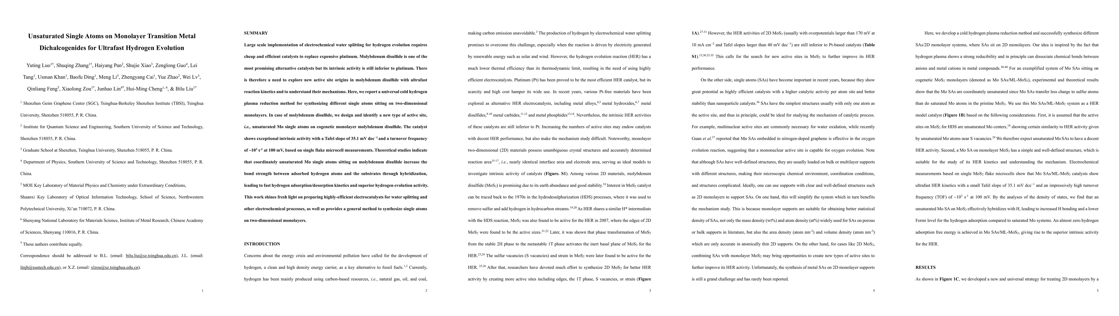This paper reports a novel cold hydrogen plasma reduction method for synthesizing unsaturated Mo single atoms on monolayer molybdenum disulfide, which exhibits exceptional intrinsic activity for hydrogen evolution with a Tafel slope of 35.1 mV dec-1 and a high turnover frequency. Theoretical studies suggest that the enhanced activity is due to the increased bond strength between adsorbed hydrogen atoms and the substrate via hybridization.