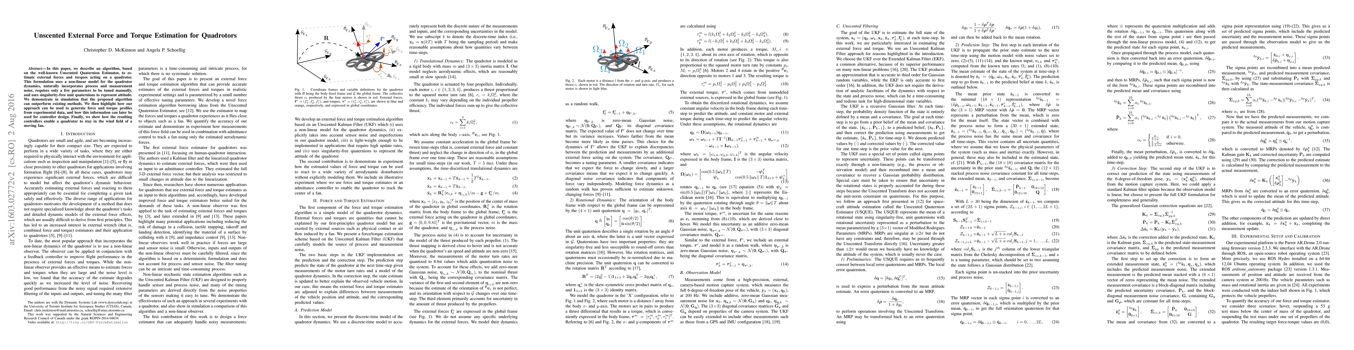In this paper, we describe an algorithm, based on the well-known Unscented Quaternion Estimator, to estimate external forces and torques acting on a quadrotor. This formulation uses a non-linear model for the quadrotor dynamics, naturally incorporates process and measurement noise, requires only a few parameters to be tuned manually, and uses singularity-free unit quaternions to represent attitude. We demonstrate in simulation that the proposed algorithm can outperform existing methods. We then highlight how our approach can be used to generate force and torque profiles from experimental data, and how this information can later be used for controller design. Finally, we show how the resulting controllers enable a quadrotor to stay in the wind field of a moving fan.