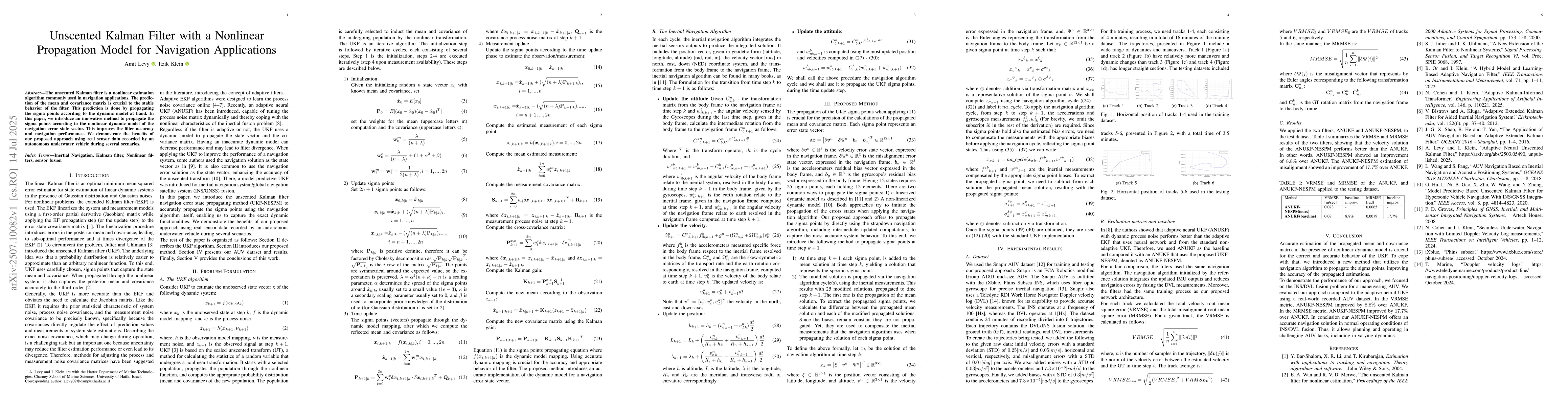 The unscented Kalman filter is a nonlinear estimation algorithm commonly used in navigation applications. The prediction of the mean and covariance matrix is crucial to the stable behavior of the filter. This prediction is done by propagating the sigma points according to the dynamic model at hand. In this paper, we introduce an innovative method to propagate the sigma points according to the nonlinear dynamic model of the navigation error state vector. This improves the filter accuracy and navigation performance. We demonstrate the benefits of our proposed approach using real sensor data recorded by an autonomous underwater vehicle during several scenarios.