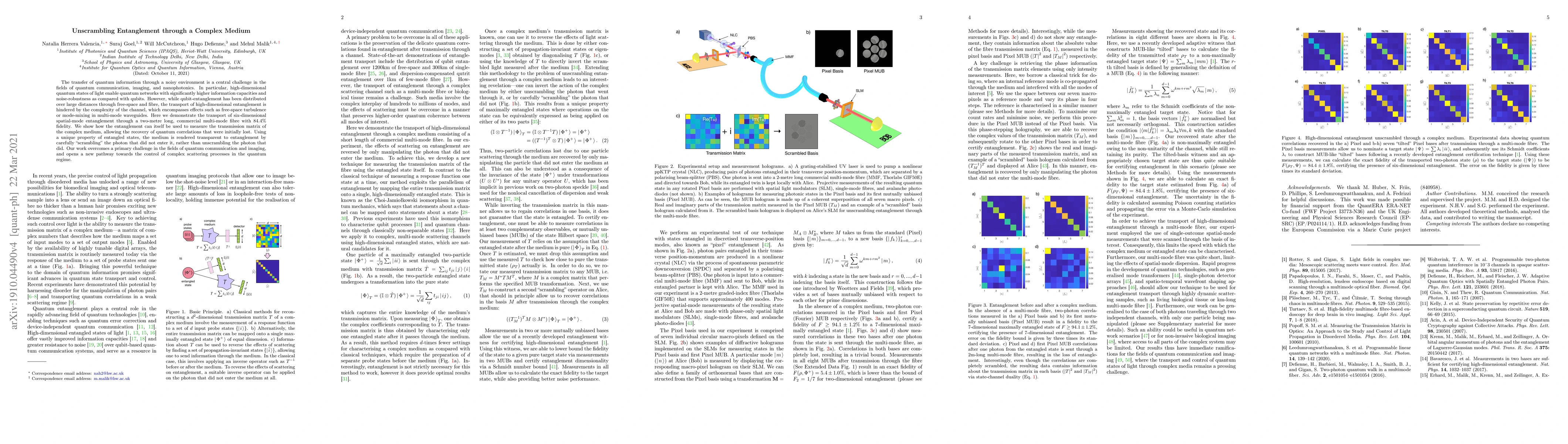 The transfer of quantum information through a noisy environment is a central challenge in the fields of quantum communication, imaging and nanophotonics. In particular, high-dimensional quantum states of light enable quantum networks with significantly higher information capacities and noise robustness as compared with qubits. However, although qubit entanglement has been distributed over large distances through free space and fibre, the transport of high-dimensional entanglement is hindered by the complexity of the channel, which encompasses effects such as free-space turbulence or mode mixing in multimode waveguides. Here, we demonstrate the transport of six-dimensional spatial-mode entanglement through a 2-m-long, commercial multimode fibre with 84.4% fidelity. We show how the entanglement can itself be used to measure the transmission matrix of the complex medium, allowing the recovery of quantum correlations that were initially lost. Using a unique property of entangled states, the medium is rendered transparent to entanglement by carefully 'scrambling' the photon that did not enter it, rather than unscrambling the photon that did. Our work overcomes a primary challenge in the fields of quantum communication and imaging, and opens a new pathway towards the control of complex scattering processes in the quantum regime.