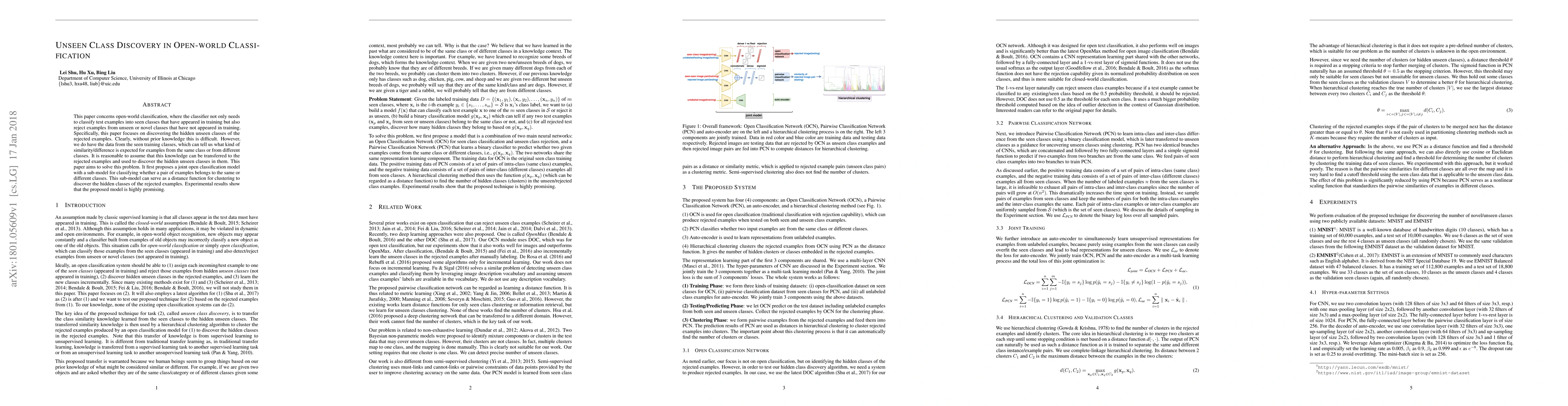 This paper concerns open-world classification, where the classifier not only needs to classify test examples into seen classes that have appeared in training but also reject examples from unseen or novel classes that have not appeared in training. Specifically, this paper focuses on discovering the hidden unseen classes of the rejected examples. Clearly, without prior knowledge this is difficult. However, we do have the data from the seen training classes, which can tell us what kind of similarity/difference is expected for examples from the same class or from different classes. It is reasonable to assume that this knowledge can be transferred to the rejected examples and used to discover the hidden unseen classes in them. This paper aims to solve this problem. It first proposes a joint open classification model with a sub-model for classifying whether a pair of examples belongs to the same or different classes. This sub-model can serve as a distance function for clustering to discover the hidden classes of the rejected examples. Experimental results show that the proposed model is highly promising.