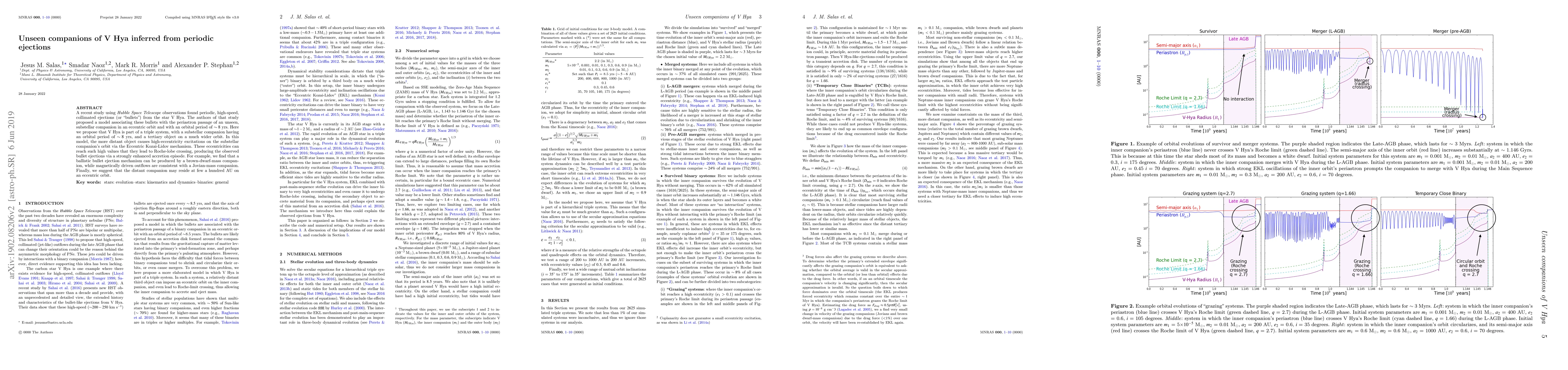 A recent study using $Hubble$ $Space$ $Telescope$ observations found periodic, high-speed, collimated ejections (or "bullets") from the star V Hya. The authors of that study proposed a model associating these bullets with the periastron passage of an unseen, substellar companion in an eccentric orbit and with an orbital period of $\sim8$ yrs. Here we propose that V Hya is part of a triple system, with a substellar companion having an orbital period of $\sim8$ yrs, and a tertiary object on a much wider orbit. In this model, the more distant object causes high-eccentricity excitations on the substellar companion's orbit via the Eccentric Kozai-Lidov mechanism. These eccentricities can reach such high values that they lead to Roche-lobe crossing, producing the observed bullet ejections via a strongly enhanced accretion episode. For example, we find that a ballistic bullet ejection mechanism can be produced by a brown-dwarf-mass companion, while magnetically driven outflows are consistent with a Jovian-mass companion. Finally, we suggest that the distant companion may reside at few a hundred AU on an eccentric orbit.