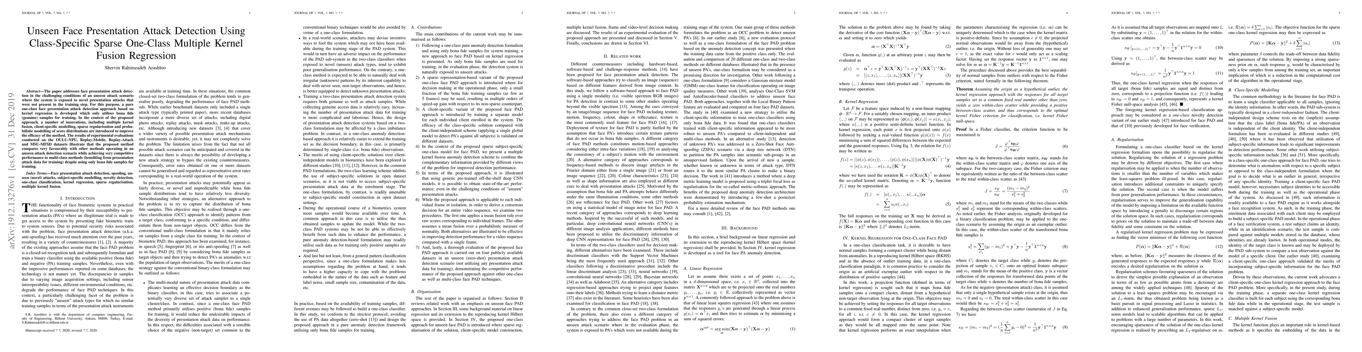 The paper proposes a novel one-class regression-based method for detecting unseen face presentation attacks using class-specific sparse multiple kernel fusion, achieving competitive performance against multi-class methods despite training only on genuine samples. Experimental results on multiple datasets show superior performance in detecting novel presentation attacks.