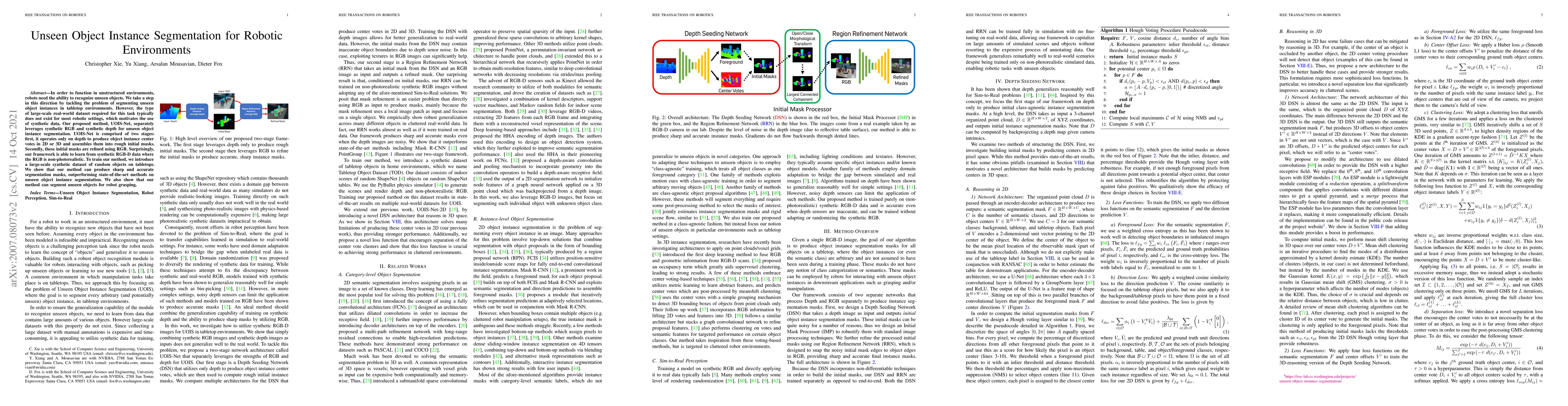 This paper proposes UOIS-Net, a method for segmenting unseen object instances in robotic environments using synthetic RGB and depth data. The method first uses depth to generate initial masks, which are then refined using RGB, achieving sharp and accurate segmentations and outperforming existing methods.
